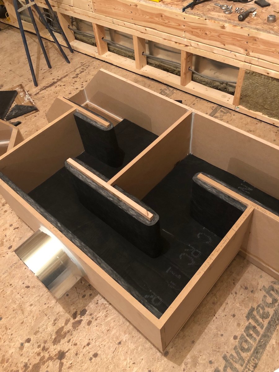 If you look at the 3D model sample of the studio in the previous post you'll see these big boxes sitting on top of my room ceilings. Those are the silencer boxes and you can also see, they take up a lot of room. They're HUGE!! To give you an idea, used almost 2x 4ft x 8ft sheets of 1 inch thick MDF to build each of these boxes and each sheet of MDF weighs roughly 120lbs. Add glue, sealant, duct liner, fasteners and I estimate each box to weigh around 250lbs if not more.
