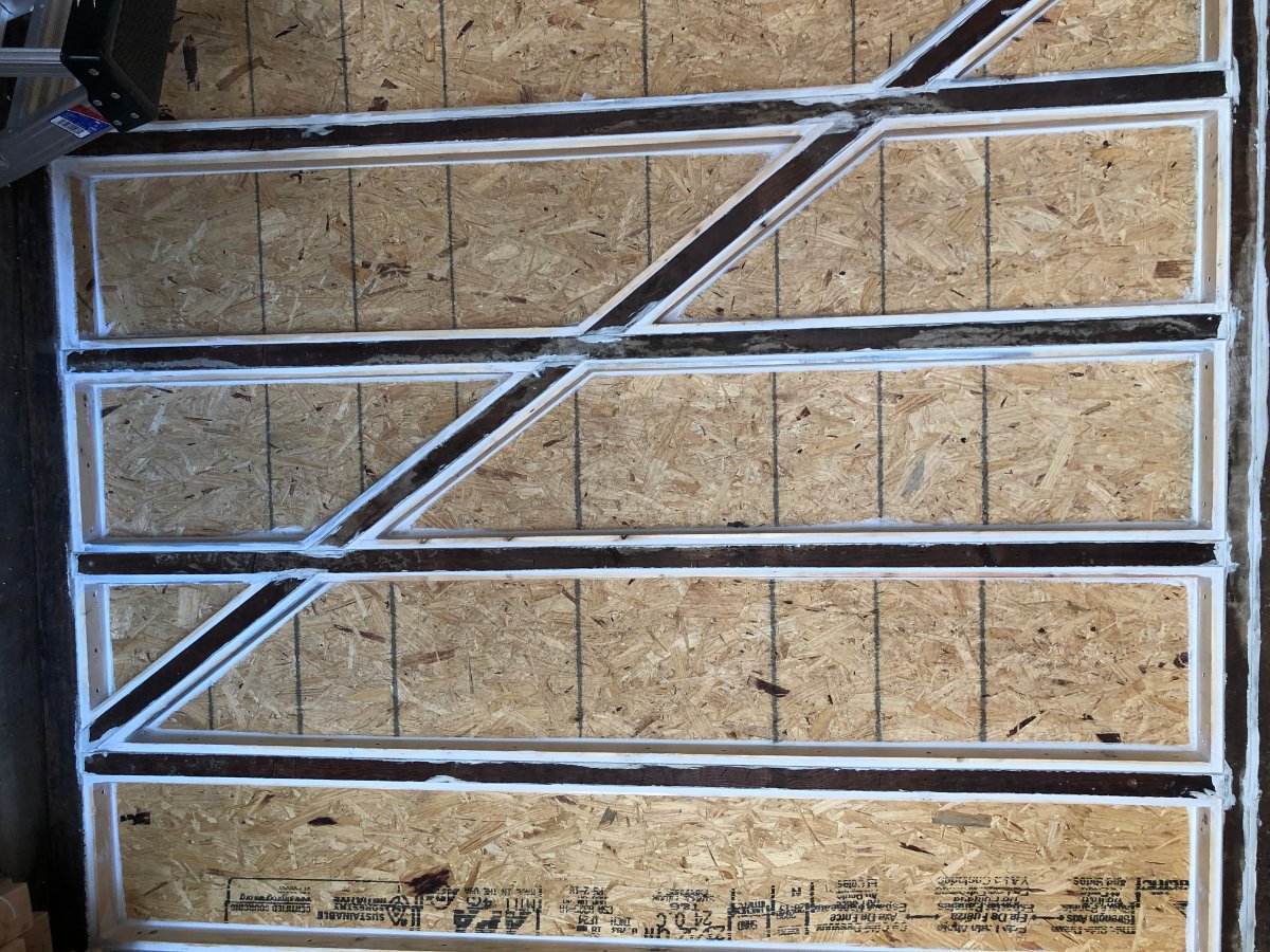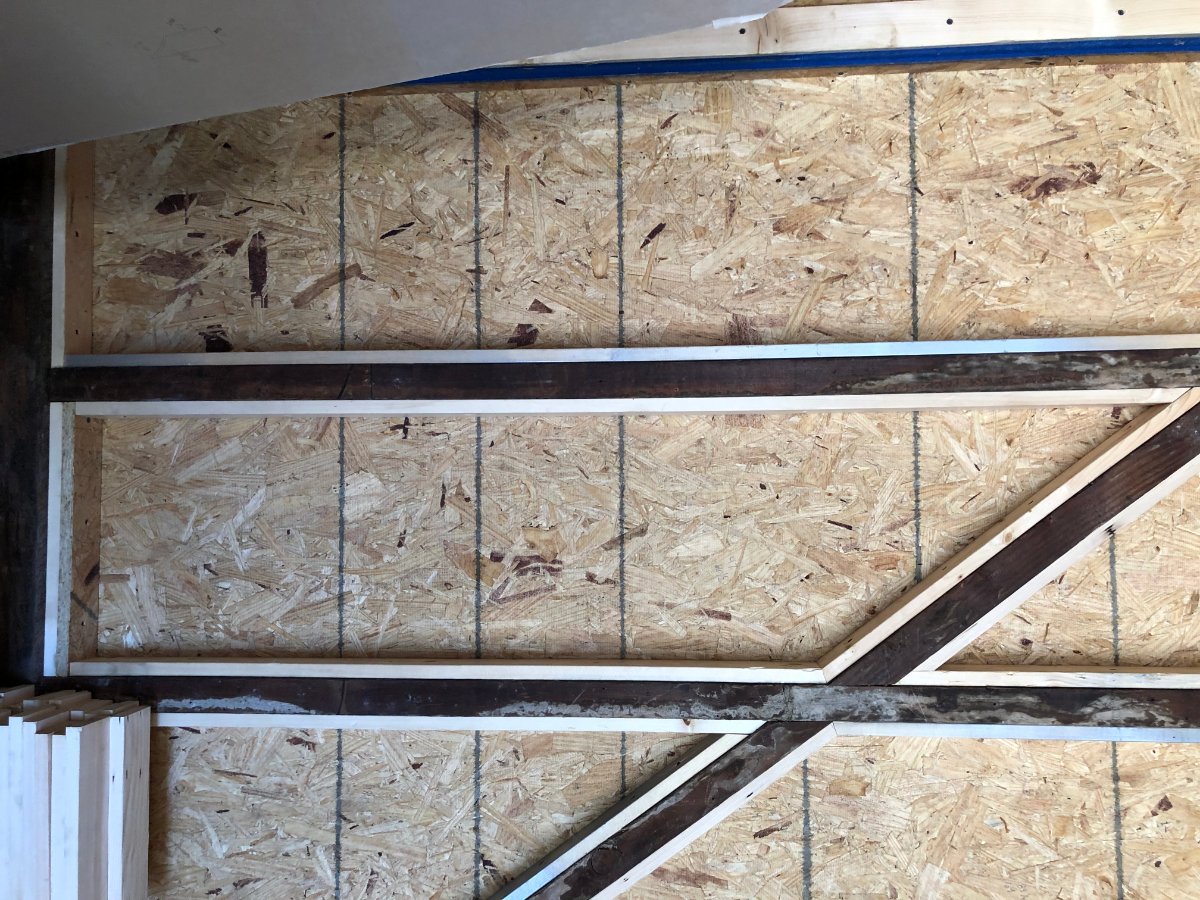 First step is to beef up the existing outer leaf. This took the most amount of time. It was extremely tedious to cut the OSB and drywall into the proper sizes and shapes because of the diagonal bracing of the existing frame. Cutting the cleats to those exact angles was a pain in the ass, but it looks great, and feels super solid.