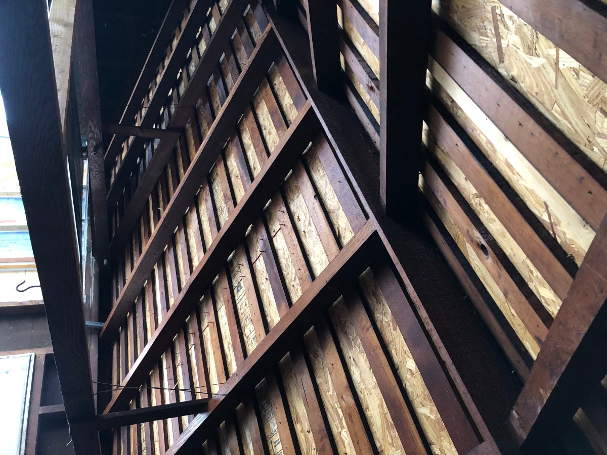 The under side of the roof has slats from north to south just above the rafters. The sheathing is then nailed to these slats. This made things slightly more complicated in that if I was to add layers of mass directly under the slats, there would be hundreds of 1" air gaps between the added mass, and the OSB roof sheathing.