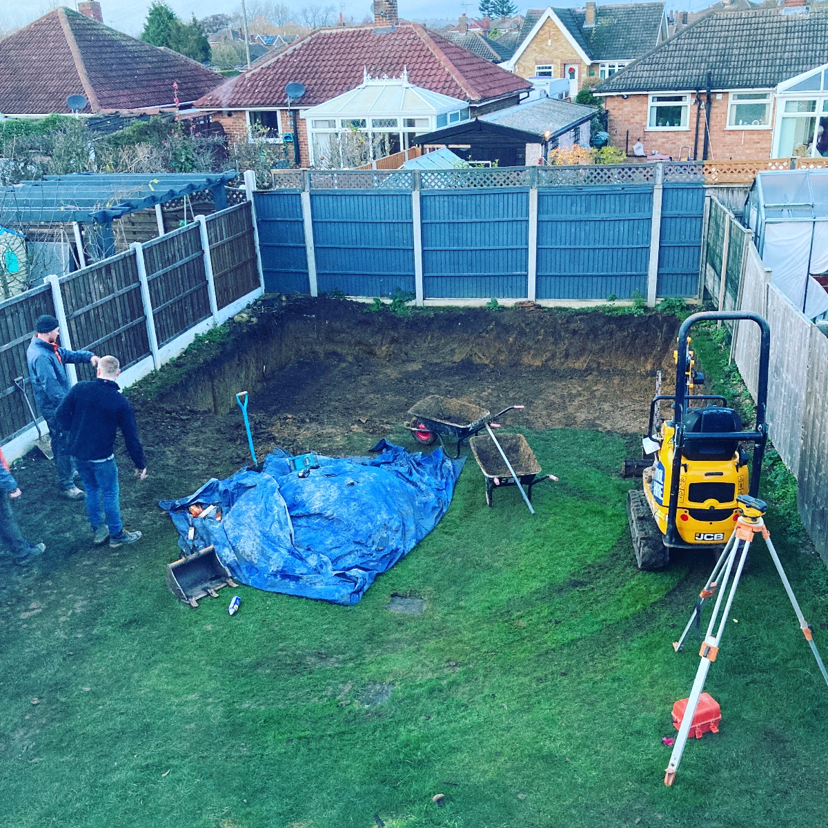 In typical British style we had a downpour today but the four guys in the garden just kept going. For two days solid we had two guys barrowing soil from back to front of the house, and I think 3 grabber lorries full taken away.
