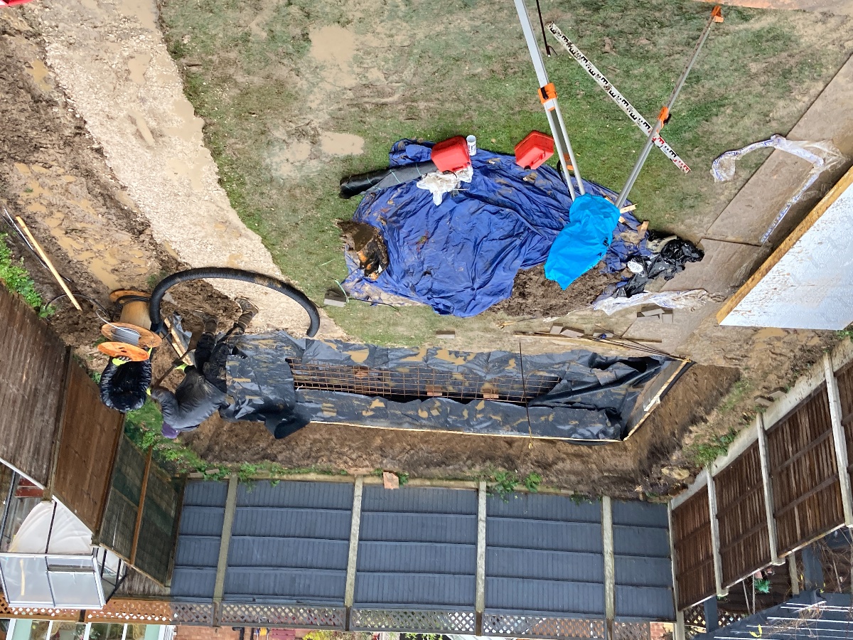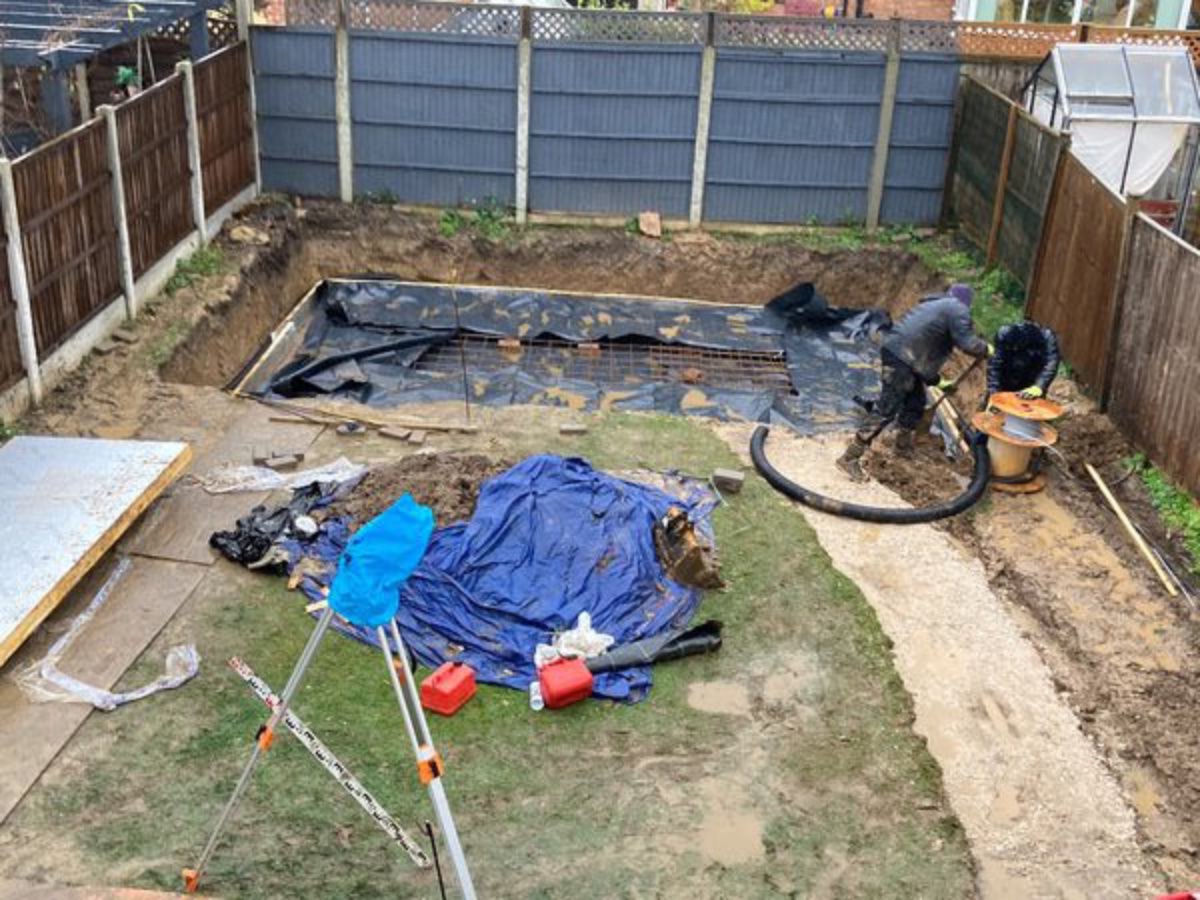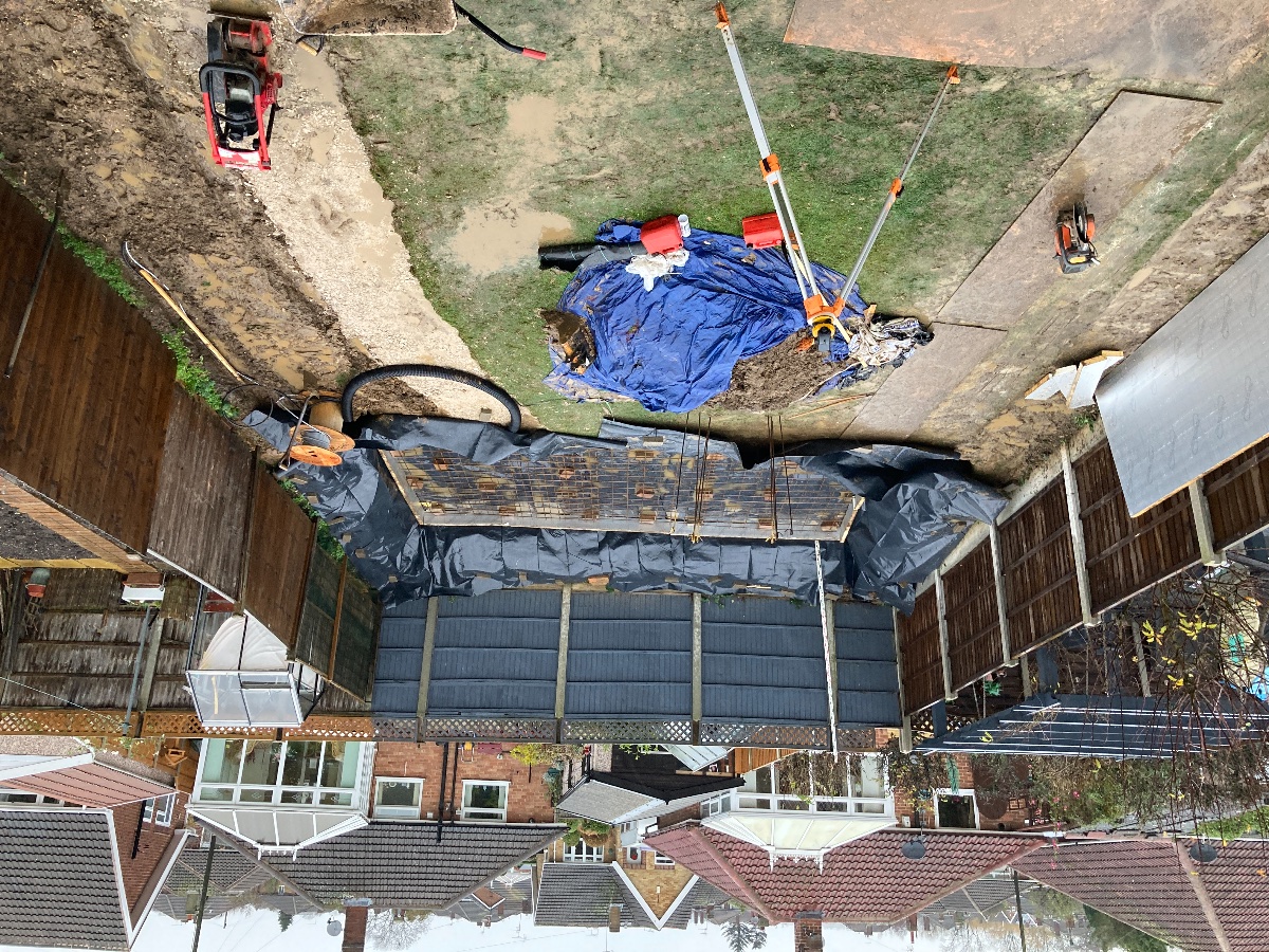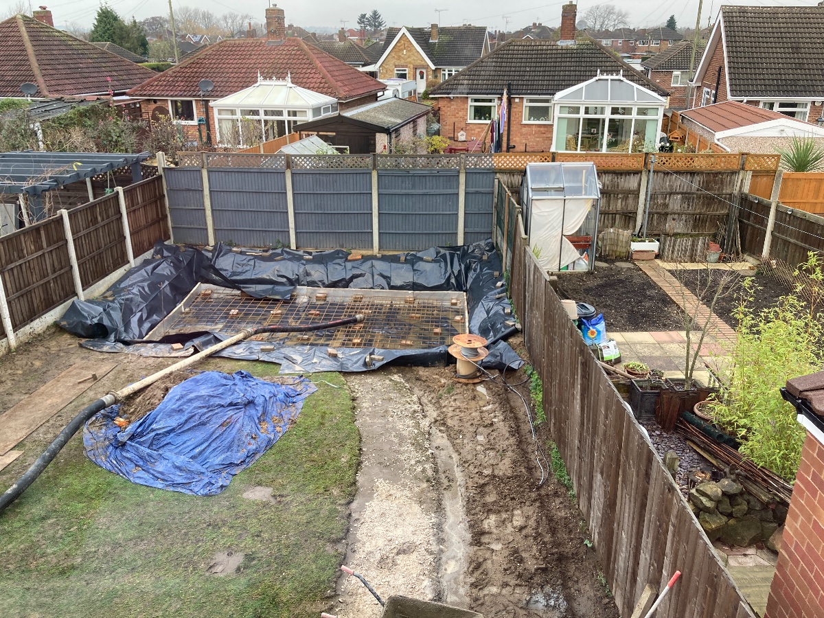 This week started with the pour of concrete into the hole on Monday - 225mm thick. Thankfully the groundworks guys were able to get it pumped from the road down the side of the house.