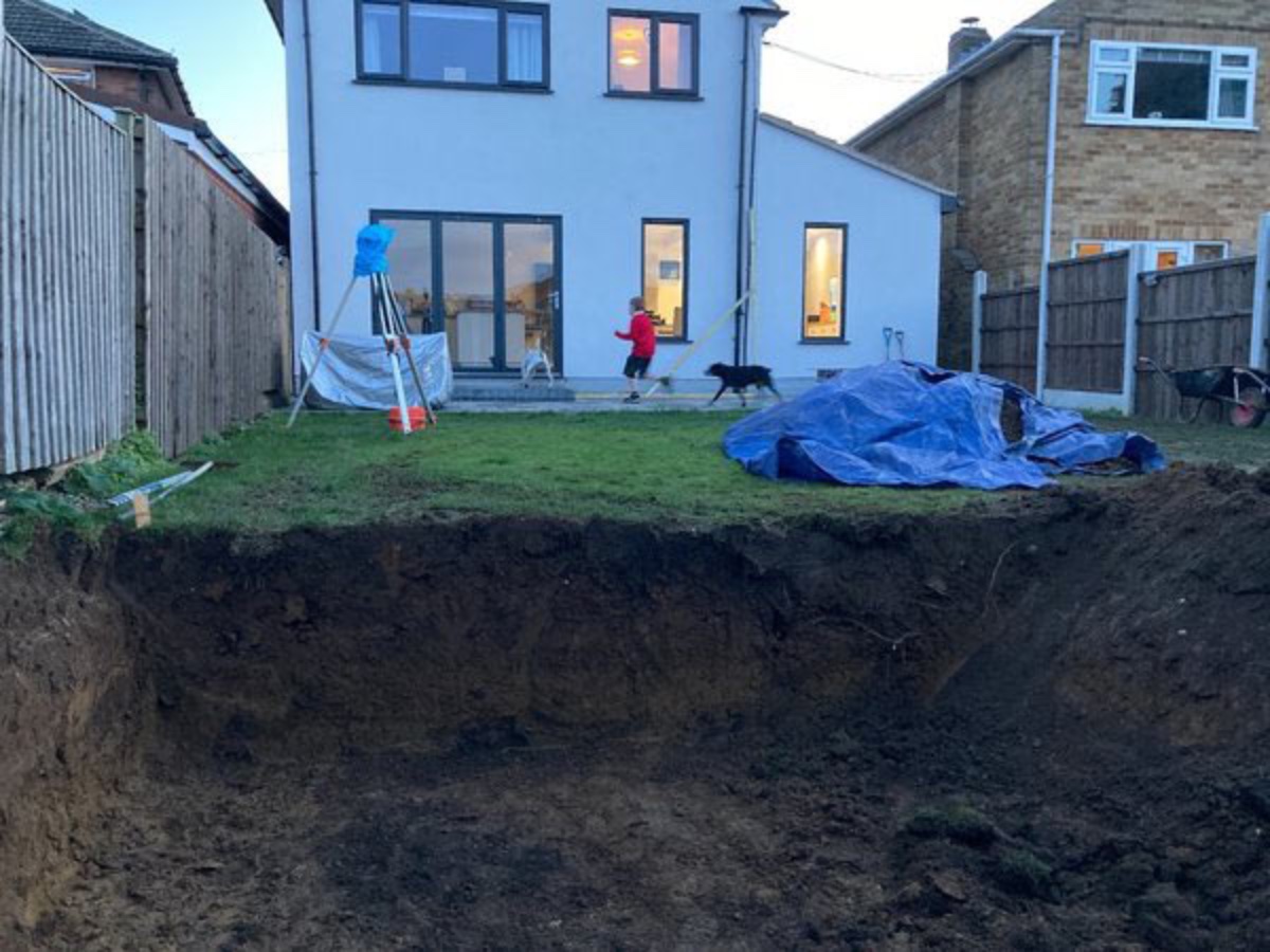 Day 1, the groundworks started with a mini digger digging the 80cm or so of ground out for my foundation - a single concrete slab. The floor level of the studio will be 350mm below ground hence the need to dig this deep. As you can see from the end day picture below, the guys managed to dig nearly 2/3 out. One grabber lorry of 22 tonnes has already been taken and there's still a pile of soil on the drive. Glad it wasn't me spending the day barrowing...