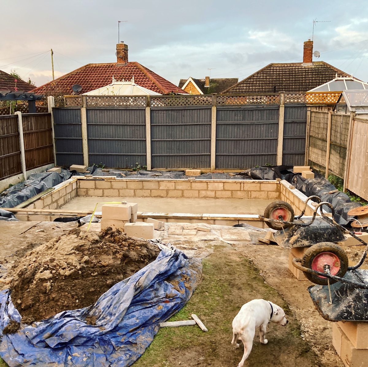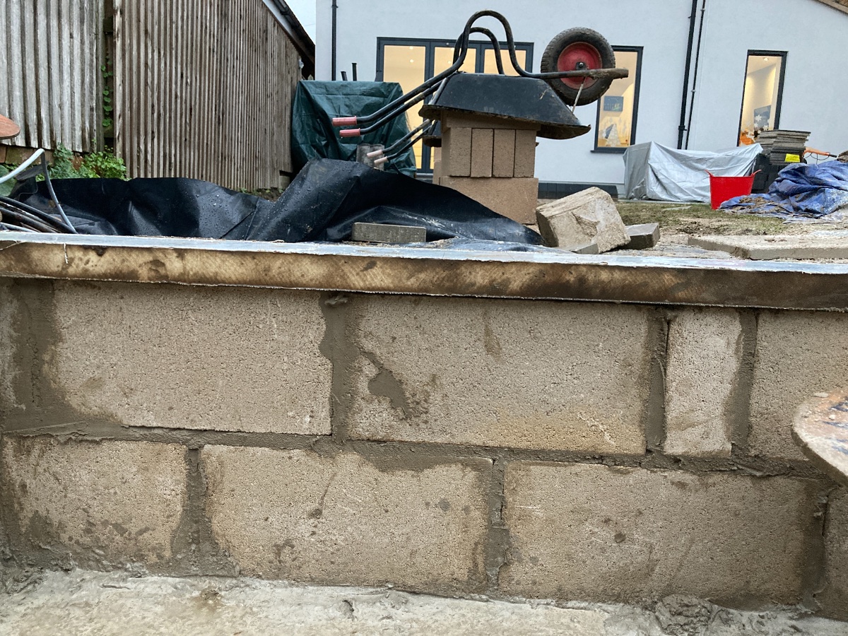 After a few days of drying the bricklayer came yesterday to build some dwarf walls. They were due back today but they decided the weather was going to be too wet so the two courses of brick on top are still to be done.