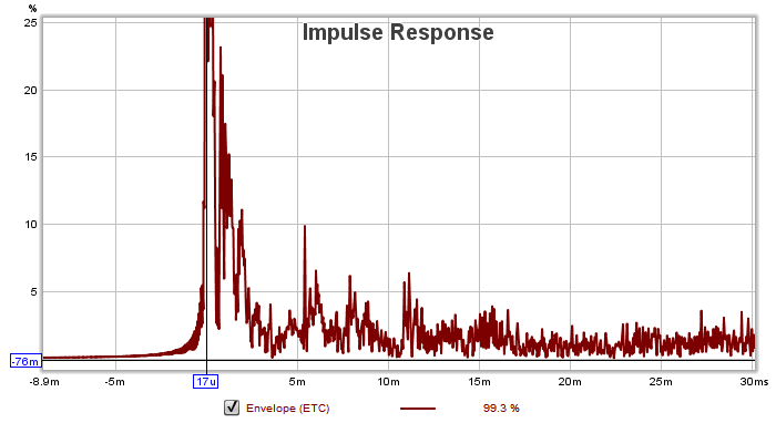 And finally, here's the "zoomed in detail" of the critical first 30 ms of the IR: That shows that the early reflections that are still going on: this hasn't changed much since the baseline, since most of those are likely coming from your desk or other things very close to the speakers: especially the ones within the first couple of ms. After about 10ms it's pretty good, but it would be ideal to try to identify some of those and eliminate them, or at least reduce them. The psycho-acoustic effect of those very early reflections is to mess with your brain's ability to accurately determine direction and frequency: those two are related in a complicated way by the way your ear works: if your ear hears the direct sound followed a very short time later by a strong reflection of the same direct sound, that creates frequency cancellation patterns inside your ear canal that fool your brain into thinking that sound came from a slightly different direction from where it really came, and that the frequency response was slightly different from what it really was. So if you can, it would be good to identify those and try to fix them.