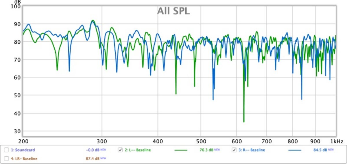 My guess about the decay times was pretty close: the T30 time is around 450 ms for each speaker individually, and 437 with both. A pretty good guesstimate!