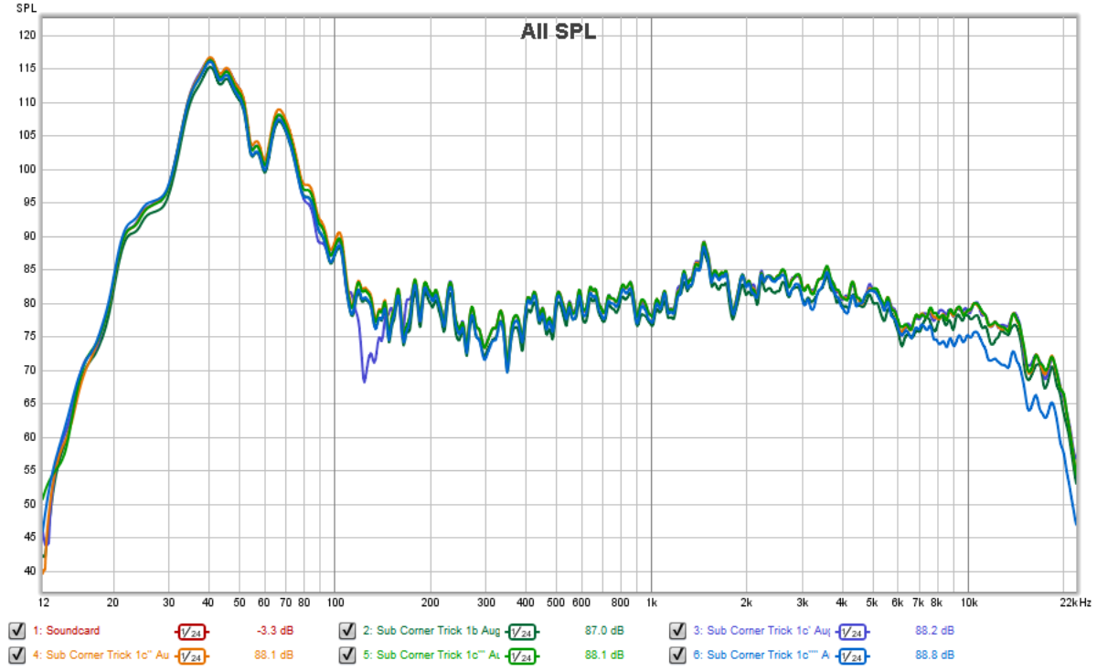 The first thing that jumps out is that there are two sets of tests, done at very different levels. The ones done on August 1 are all at the correct level: around 85 dBC, but the ones done the next day are about 30 dB lower! Around 55 dB. You most definitely would have noticed such a large difference in level if that were a speaker setting, so I'm assuming that this is just a soundcard calibration issue: you didn't re-calibrate the levels on August 2nd. If that's the case, then I can just boost all of those measurements by 30 dB within REW... but that is only valid if this is just a REW calibration issue. I can't do that if the levels in the room were actually lower.