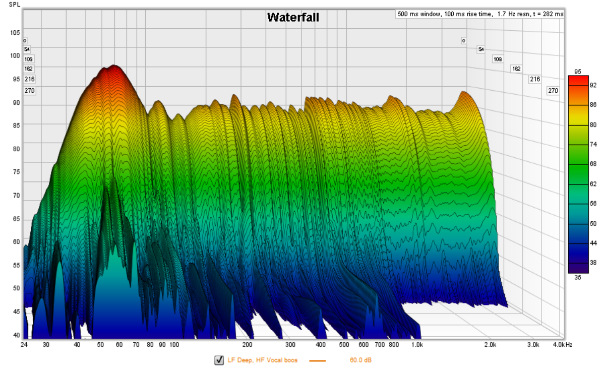 The other interesting thing you can see there is that, even with the LF set to "flat", there is actually a pretty big LF boost! It's roughly 4 dB boost at 71 Hz, with fairly tight EQ. That's probably the bass reflex ports, and there is some low-level ringing going on there, so that makes sense. You can see that here too, in the waterfall plot, below...