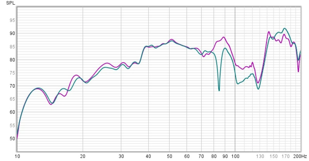 After measuring with REW I was initially confused by what I was seeing. There were greater dips and peaks in places. Looking at the REW screenshot below I noticed that the dip at 84Hz with superchunk corresponds to 1.0.0 and the peak at 89Hz corresponds to 0.1.0. (All of the sudden they're looking a little close for comfort.) Considering that the mic was dead in the middle between the side walls and 18" forward of the middle lengthwise I'm thinking the energy of 0.1.0 was masking the dip at 84Hz? Is masking the correct term there? The next biggest green peak is at 168Hz which would be 2.0.0 if my thinking is right.