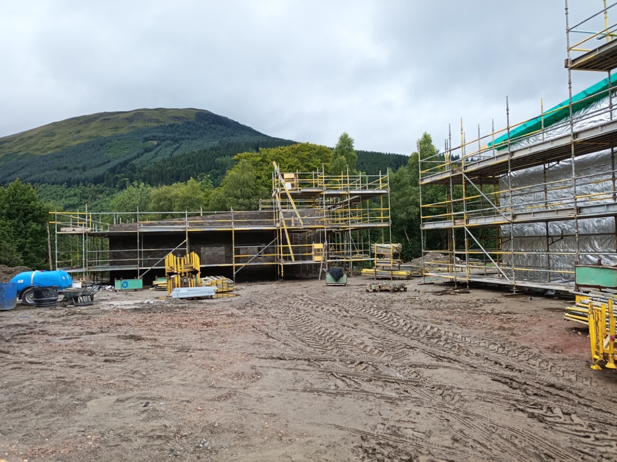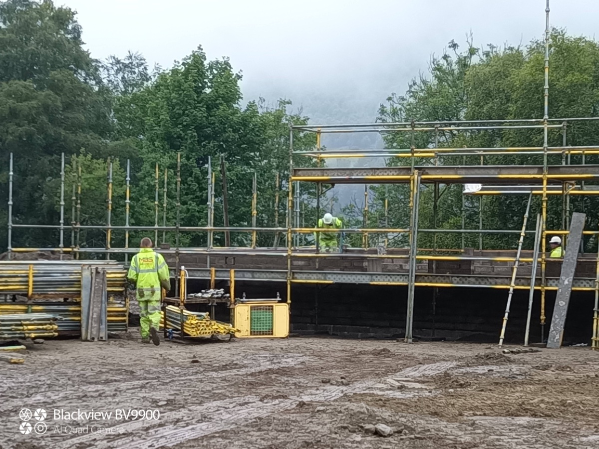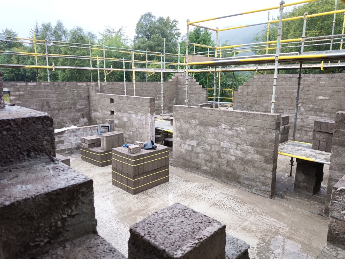 With the slab in place we moved on to some SERIOUS scaffolding and a squad of brickies laid a few thousand concrete blocks.
