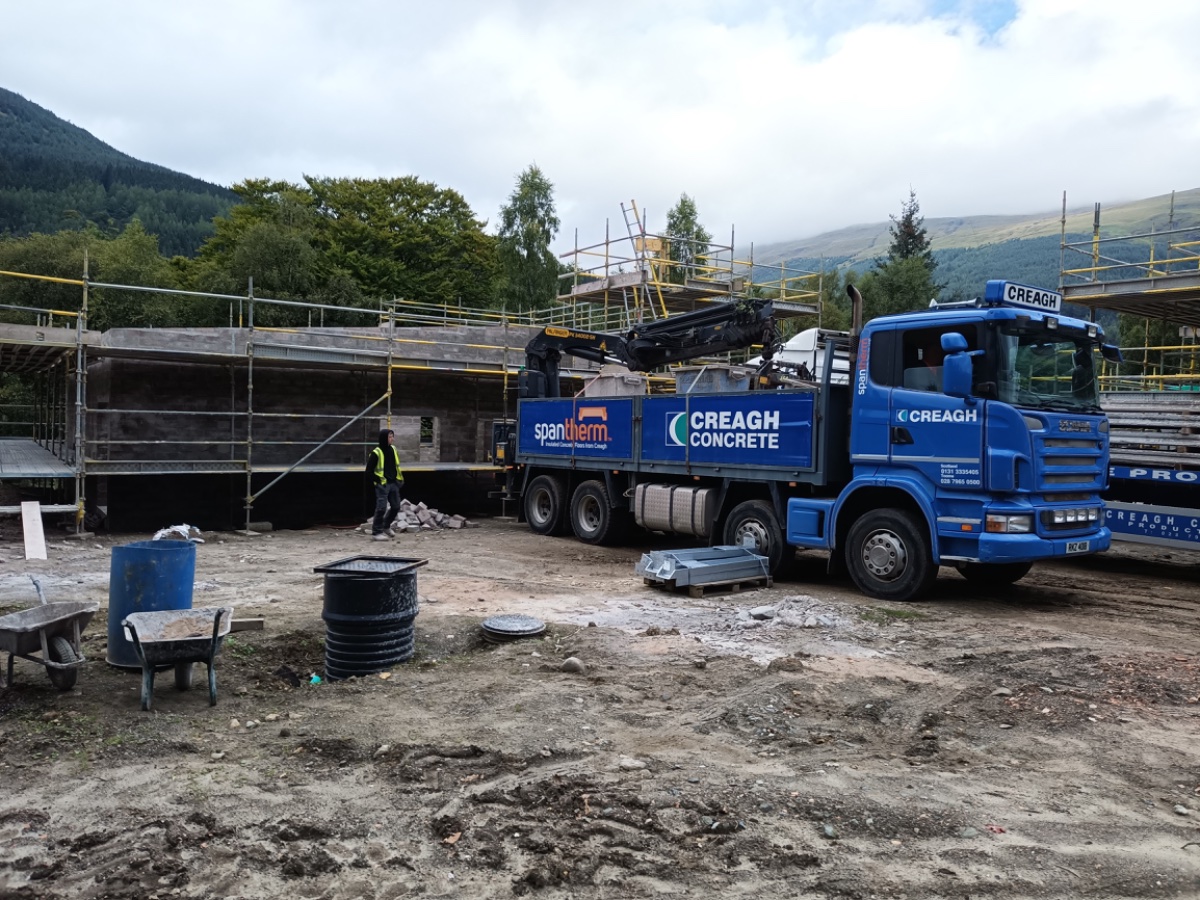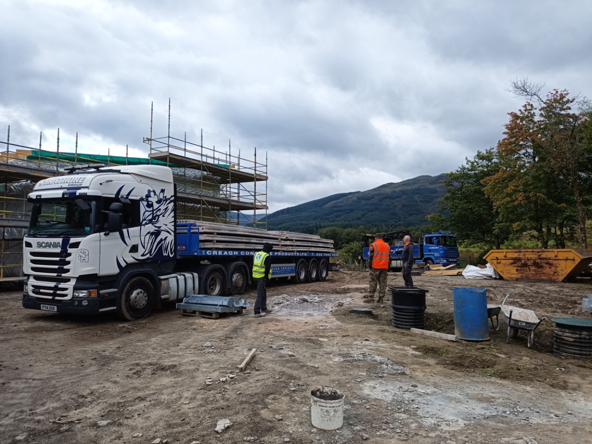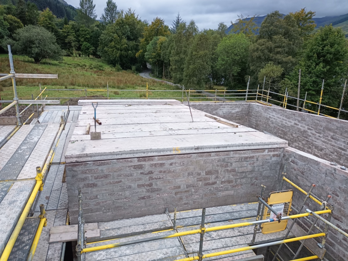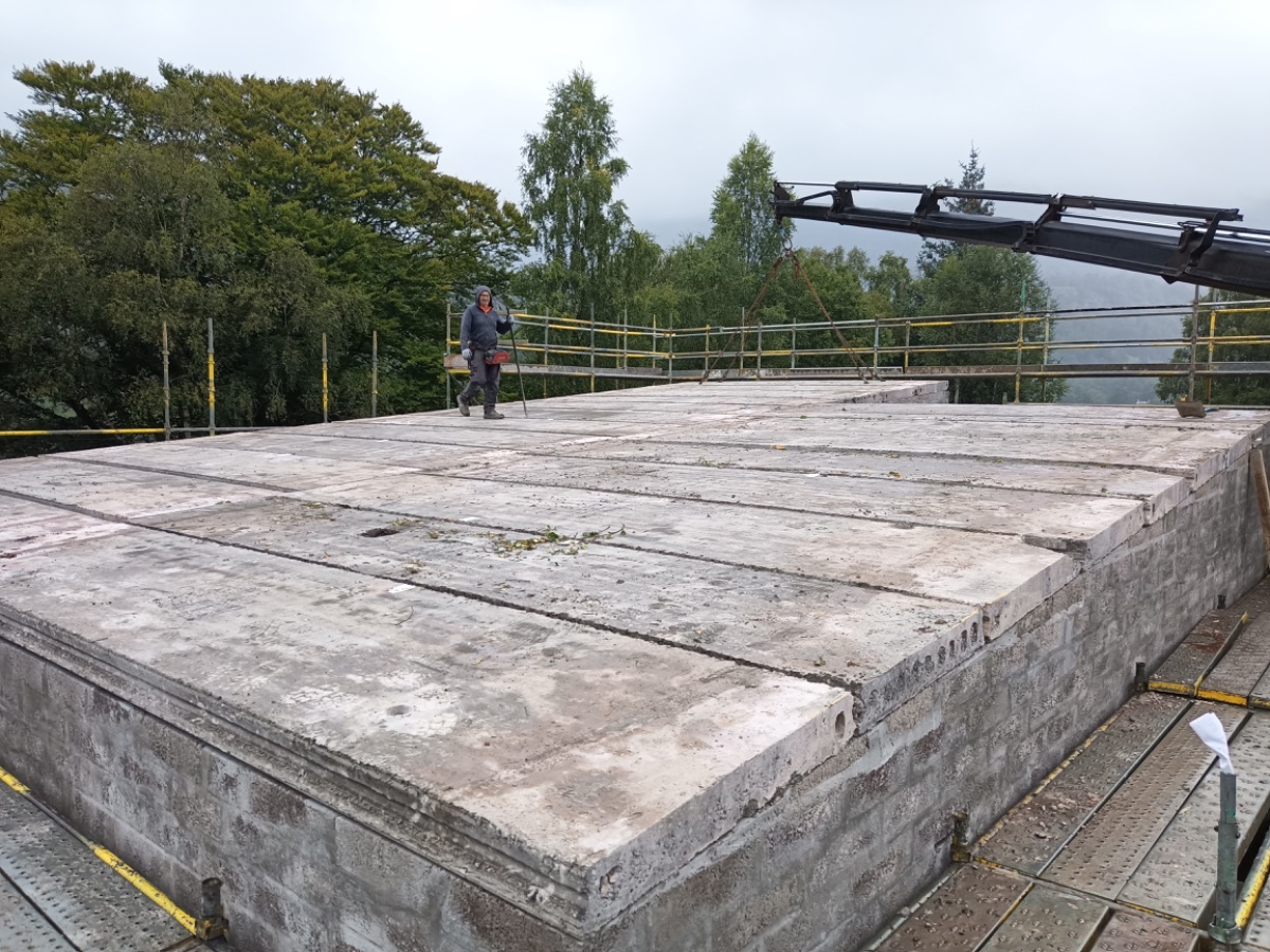 With the block work complete the prestressed concrete roof arrived. The arctic came the previous night and the driver slept in his cab until we arrived in the morning. We had a few extra hours hanging around as the poor hiab driver’s satnav took him down the “back road” which has a 7.5 ton bridge at the end of a single track road with no passing places. He had no option but to reverse back out until he eventually found a spot to turn then backtrack to the “main road”. I say main loosely (very loosely). It is still pretty much single track but at least has passing places and no bridge with a weight restriction at the end of it.