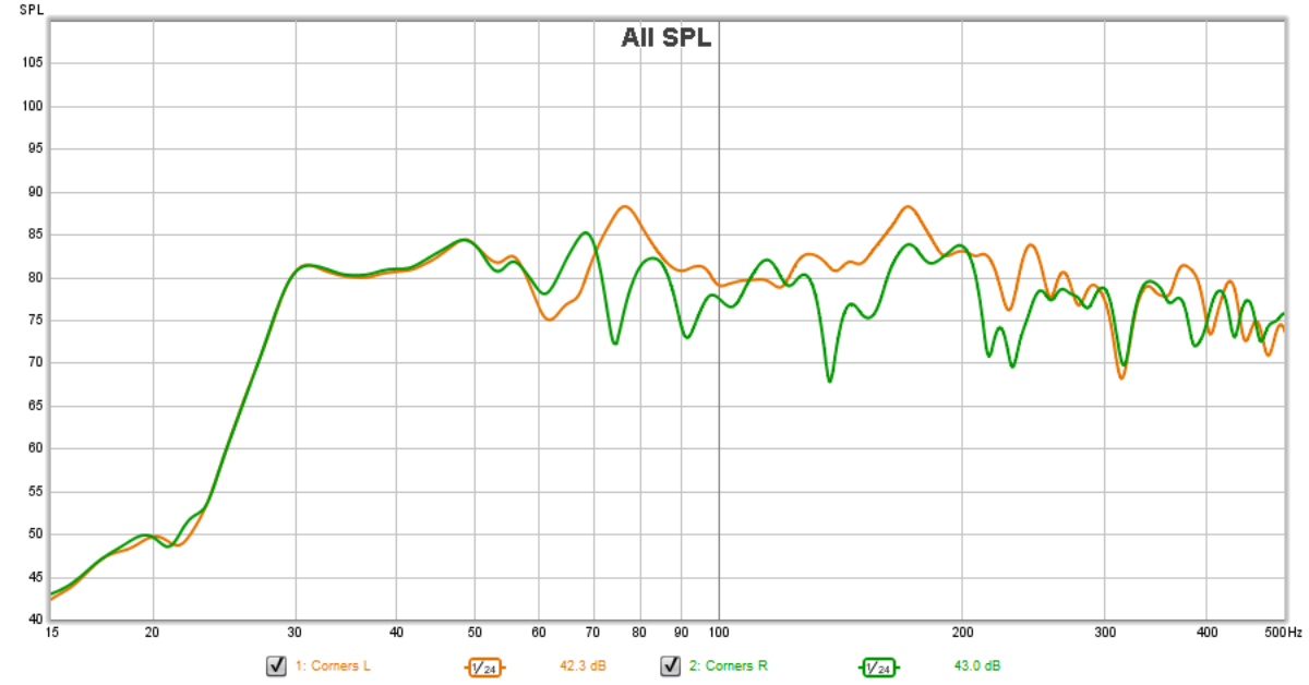One final test which is interesting is another full L / R / L+R measurement from the exact mic position from the "Symmetrical Baseline" test, but with the speakers moved to the corner position.