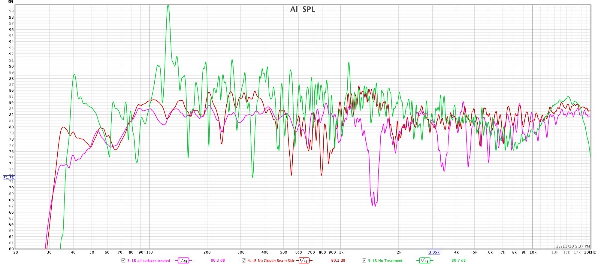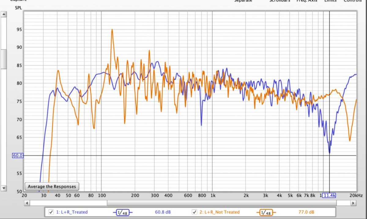 As you can see in the REW measurements there is an substantial improvement compared to the non treated room where everything is more smoothed out. From 20hz to 500hz there are still dips here and there but only 3db difference from 80db excluding 300hz area. Huge dip at 800hz and massive dip at 10-12khz, The room definitely sounds much better now compared to prior of treatment, the low end is much tighter, I’ve also noticed a very strong resonance in the high freq when I’m inside the room I assume it is the untreated ceilings.