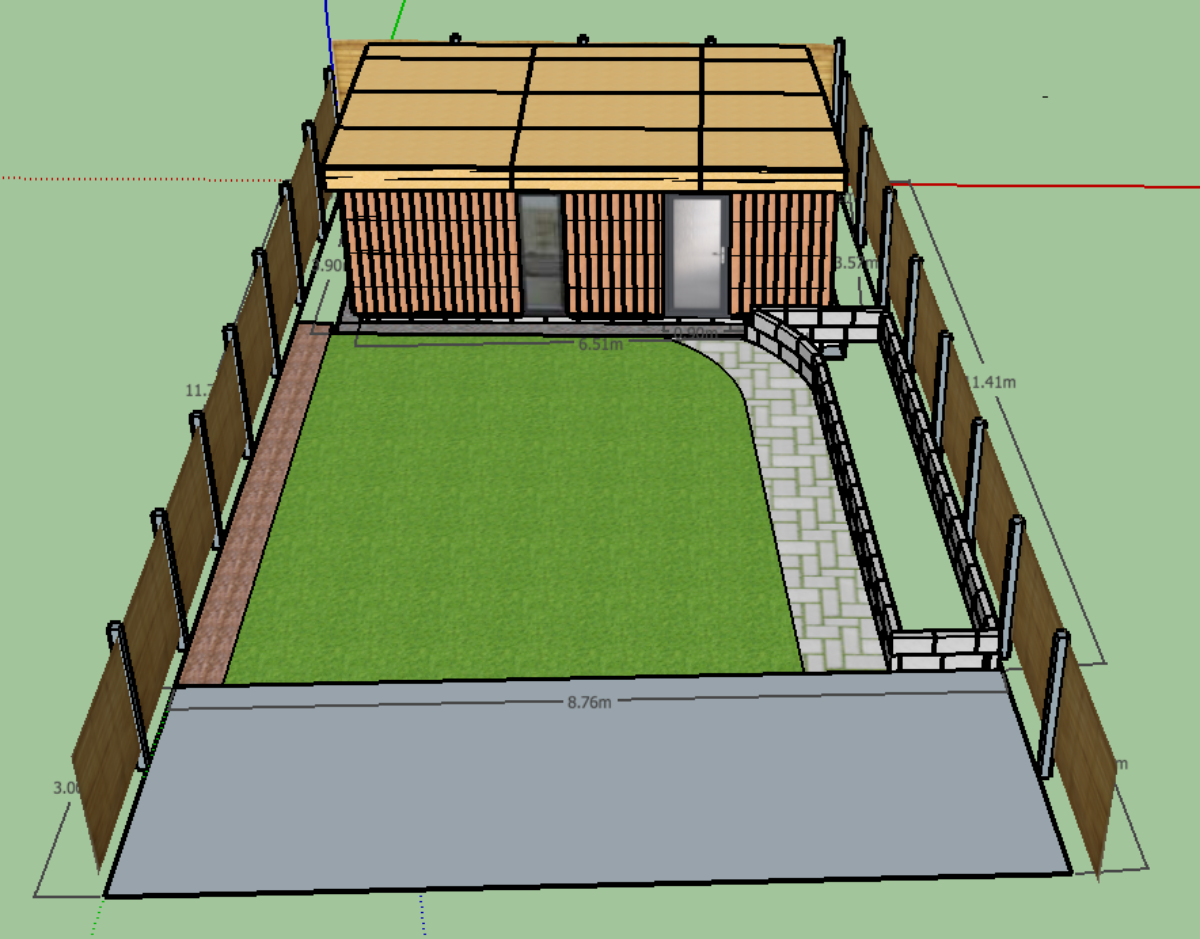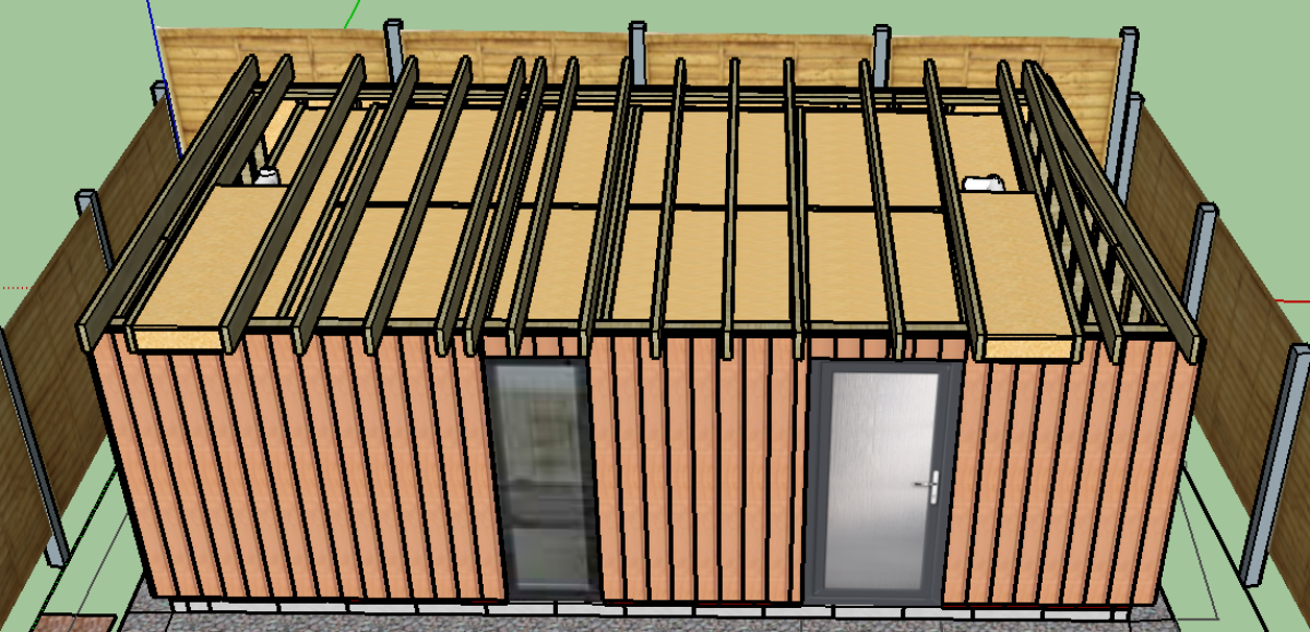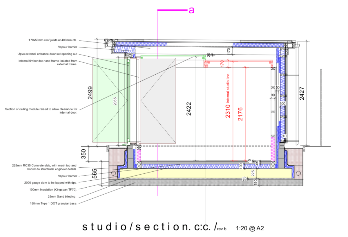 The whole building will be sunk into the ground so that the top of the concrete block is 350mm below ground level. This will give me enough head height whilst staying within the permitted development rules. The highest part of the building (the front) will be 2.4m about ground.