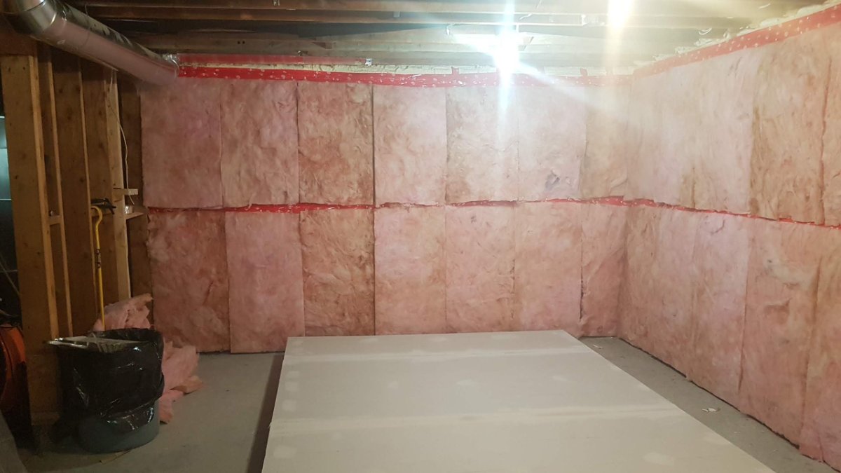 Loos hanging 1" pink fluffy against the XPS rigid (this is the air gap ... 1" is very small, but it's better than nothing!) And the block wall has a lot of mass. On the floor is the first build "inside-out" wall panel