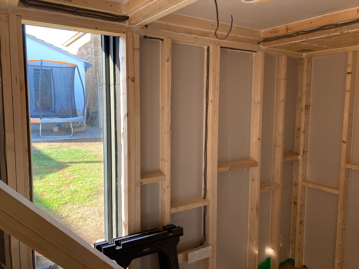 Since my last post I’ve been progressing the cable clipping and wiring of sockets etc. Like with so many things about this build, it amazes me how long it takes to do certain jobs. Cable clipping the mains power and lighting cables around the top of the frame and down the studs to the sockets has taken longer than expected. I can’t finish the job as I am waiting for some washers to arrive that will enable me to bolt the ceiling joists together and I have a bunch of cables running around one particular bit of ceiling to get back to the consumer unit. These will all be hidden.