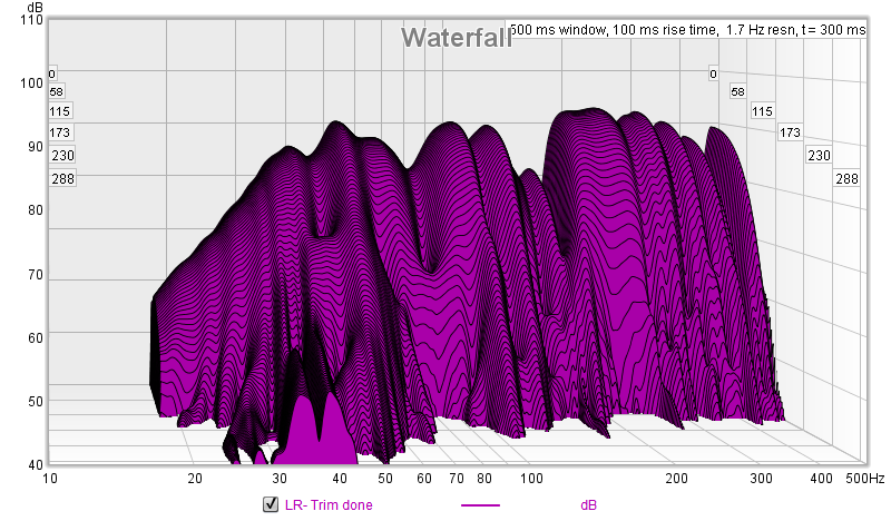 Soundman2020 wrote:It is ALWAYS hard to produce a good RFZ in most small rooms!However, I’ve tried that before and it seems that it is really hard to get a good working reflection free zone that way if I only use an angled cloud instead of the two angled plates that are connected to the flush mounting baffle.But it's a lot easier if you have a cloud that you can adjust the angle of, to tune the room as needed. In the room for the graphs that I showed above, I initially go the angle wrong, and needed to adjust it. I was getting unexpected reflections (I still don't know where they came from), but changing the angle of the cloud fixed it. And it also fixed some other issues. Clouds can be used to do a lot more than just establish an RFZ: The can also be used to smooth out bass issues, for example. Sticking to the example of the same room, here's the "before" and "after" waterfall plots regarding the cloud: You can clearly see the huge improvement in the low end. Clouds can do lots of things: CID panels can't.