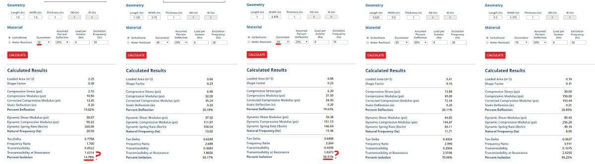 And here are the results I get for each duro (adjusting the length & width of the isolators by 1/8" increments until the deflection is close to 20%)