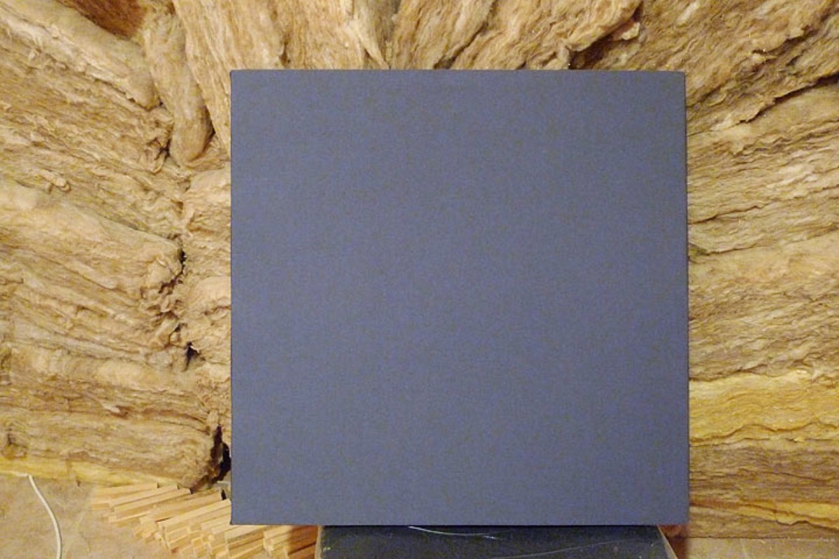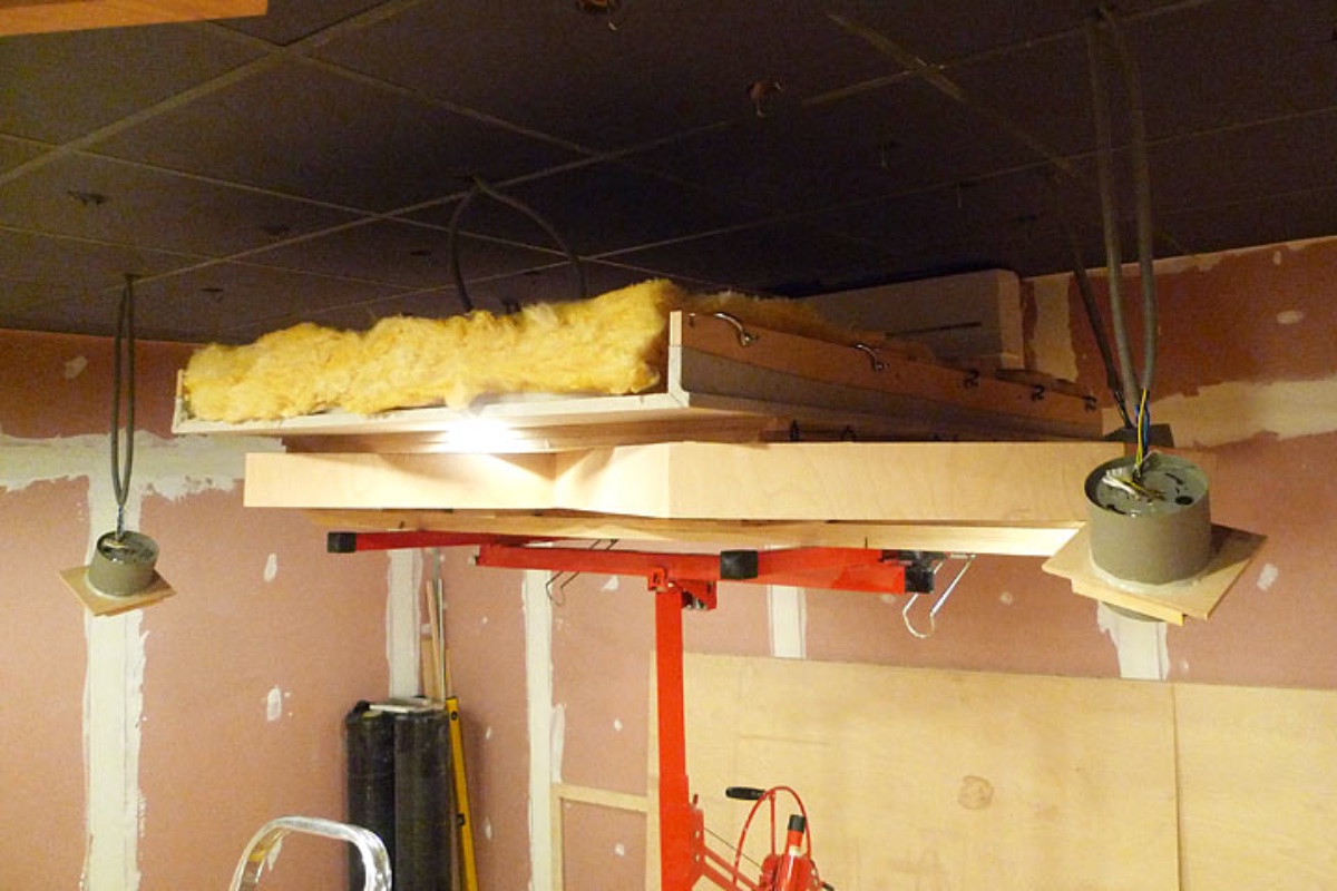 I thought of the three cloud sections as three massive drop ceiling tiles. I worked in a slightly different order: first I stapled the breathable fabric to the underside, then the chicken wire to the upper side (you can see a few ends in the photo below) which means the chicken wire has the thickness of the wood in which it can bow under the weight of the insulation and not been seen as a bulge from below. The polyester batting was laid on top of the chicken wire and then the insulation on top of that. The polyester batting is part of John Brandt's design so I had no choice; it was on the drop ceiling tiles and the cloud and will be on the front edge of the wall traps too.