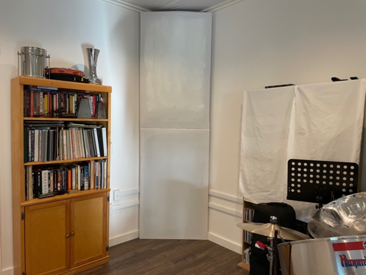 I made eight corner bass traps yesterday, two per corner, each half the distance from floor to ceiling. The total distance is 9'-4" from floor to ceiling. So each trap is 4'-6", leaving a 2" space up top which we may cover with molding or not.