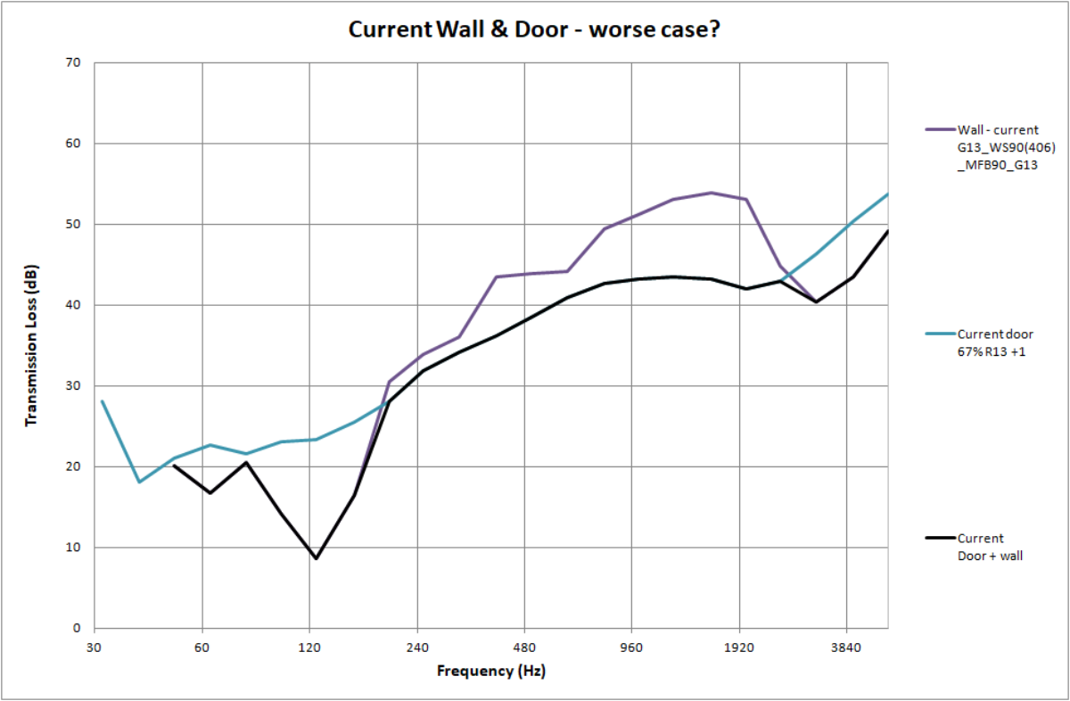 I already have some plans to improve this, but first a question: is it possible to combine these two plots to give a graph of the attenuation across the frequency spectrum to the entire combined parition? One possible way that has occurred to me, inspired by the observation that a relatively small hole in a partition causes for more harm to the sound isolation properties of a partition than its size would suggest. Could this be the worse case? This is to assume that the weakest link in the chain at any point determines the response for the entire partition. This would give the black line in the graph below;