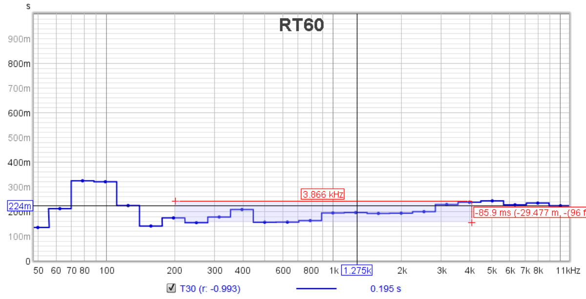 RT-60 decay times in one-third octave bands (Full 1/3 spectrum, 45 Hz to 12 kHz.) The horizontal cursor line marks the original design goal for the room, at 200 ms. :