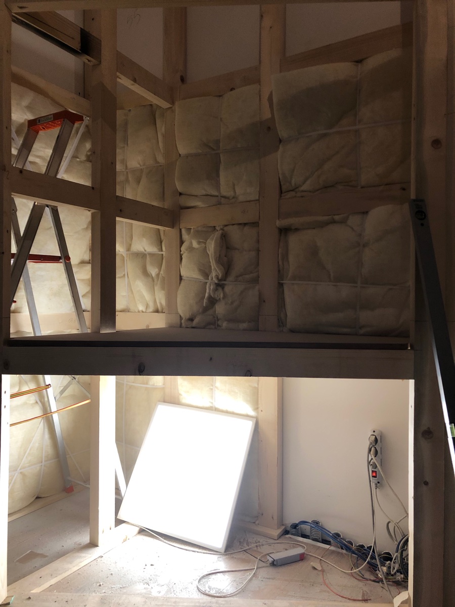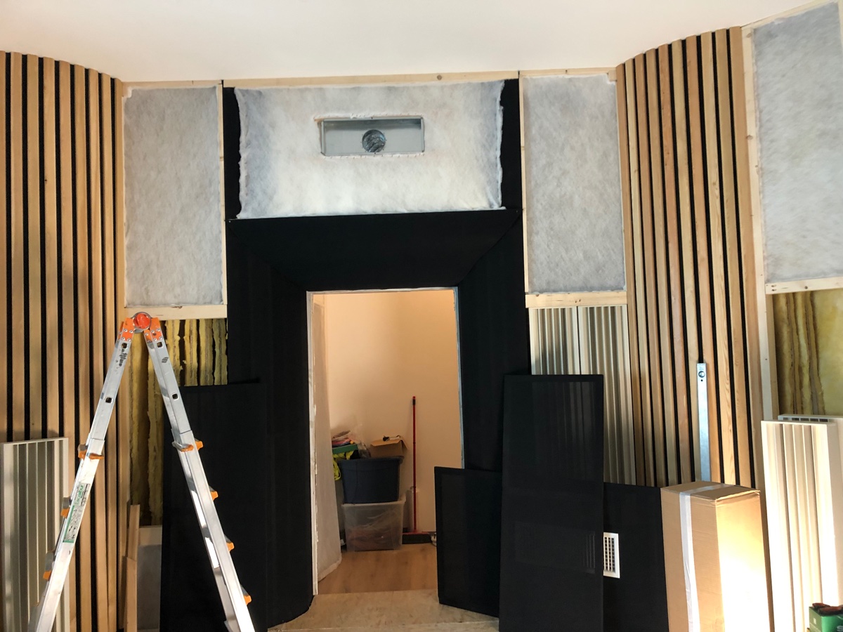 Guys .... it was really a hard job even if you don't perceive much from the pictures, especially to make and assemble the "hangers" made with a 12mm chipboard core and 30mm fiberglass on each side with a density of 20kg / mc, I don't remember the flow resistance but I think about 10000. The heaviest panels are over 40kg, consider that the height of the room is 3.48mt.