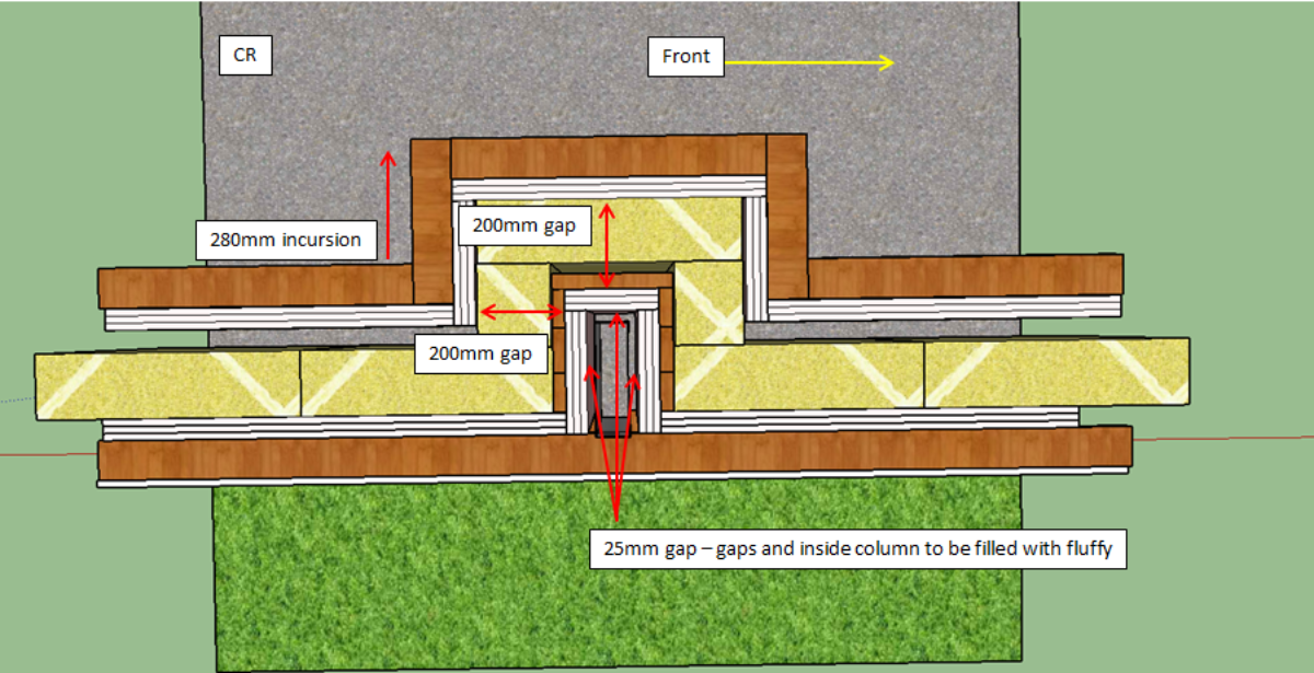 2. More critically, my cladding will be screwed to the outside of the outer timber frame so my first isolation leaf has to sit on the inside of that timber frame. This timber frame itself also has to sit on the outside of the column - as that lines up with the beams above.