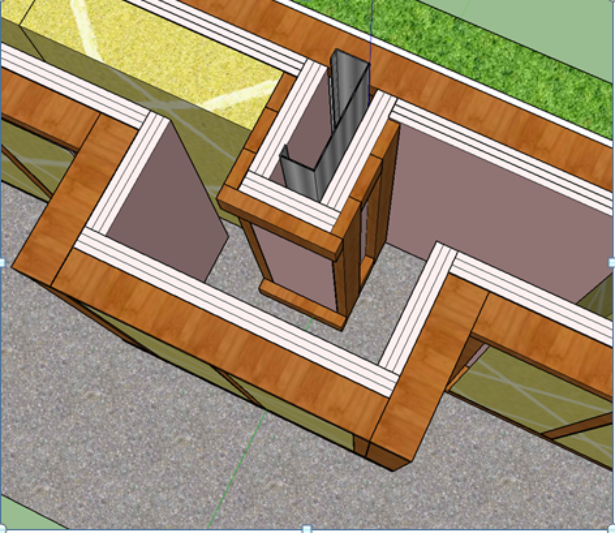 To follow through the “mass on the outside” approach, I took Glenn’s diagram and made some modifications. The first modification is to move the outer frame outside the mullion column we’ve been focusing on rather than butting up against it – the reason for that becomes clear when I include the column at the end of the wall – the frame needs to butt up against the end wall column to allow the cladding to sit in front of the column in the corner. I’d lost track of this in focusing on just the isolation around the mullion column.