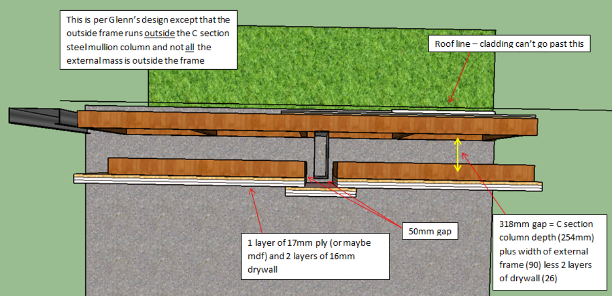 2. More critically, my cladding will be screwed to the outside of the outer timber frame so my first isolation leaf has to sit on the inside of that timber frame. This timber frame itself also has to sit on the outside of the column - as that lines up with the beams above.
