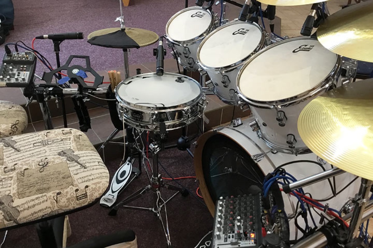 Since the latest lockdown ended in January I have been focussing on the sound of my main kit in a church across town, playing with the sound of the kit in the very reverberant building and figuring out how best to close mike it using 8 mics, aiming to get the best sound (to my ears) with minimum bleed from the rest of the band. Neither studio nor live miking techniques quite work in this situation so it has given me an interesting challenge. Here is a quick glimpse of the setup so far, starting with the overview where the high-hat and snare mics are most clearly visible.