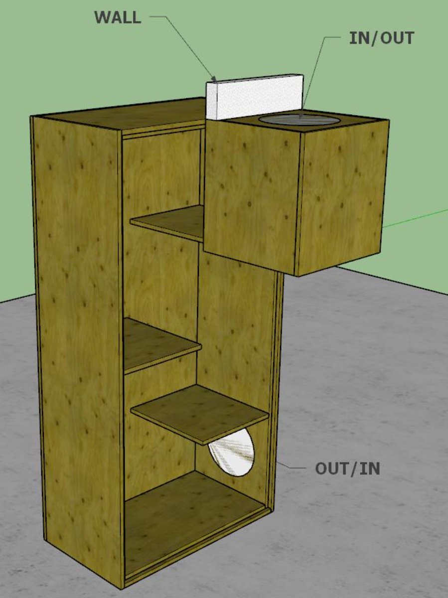 This thread seems as good a place as any to ask about the outer silencers. I think this design is pretty standard but I wanted to make sure the wall penetration is sufficient to maintain isolation. The silencer would all be 2 layers of mass, as is the wall. It's a bit more complicated this way because I would want the input/output to point directly up, thus avoiding a 90 deg bend in the duct and keeping space to a minimum. It also adds an extra "bend" for the airflow.