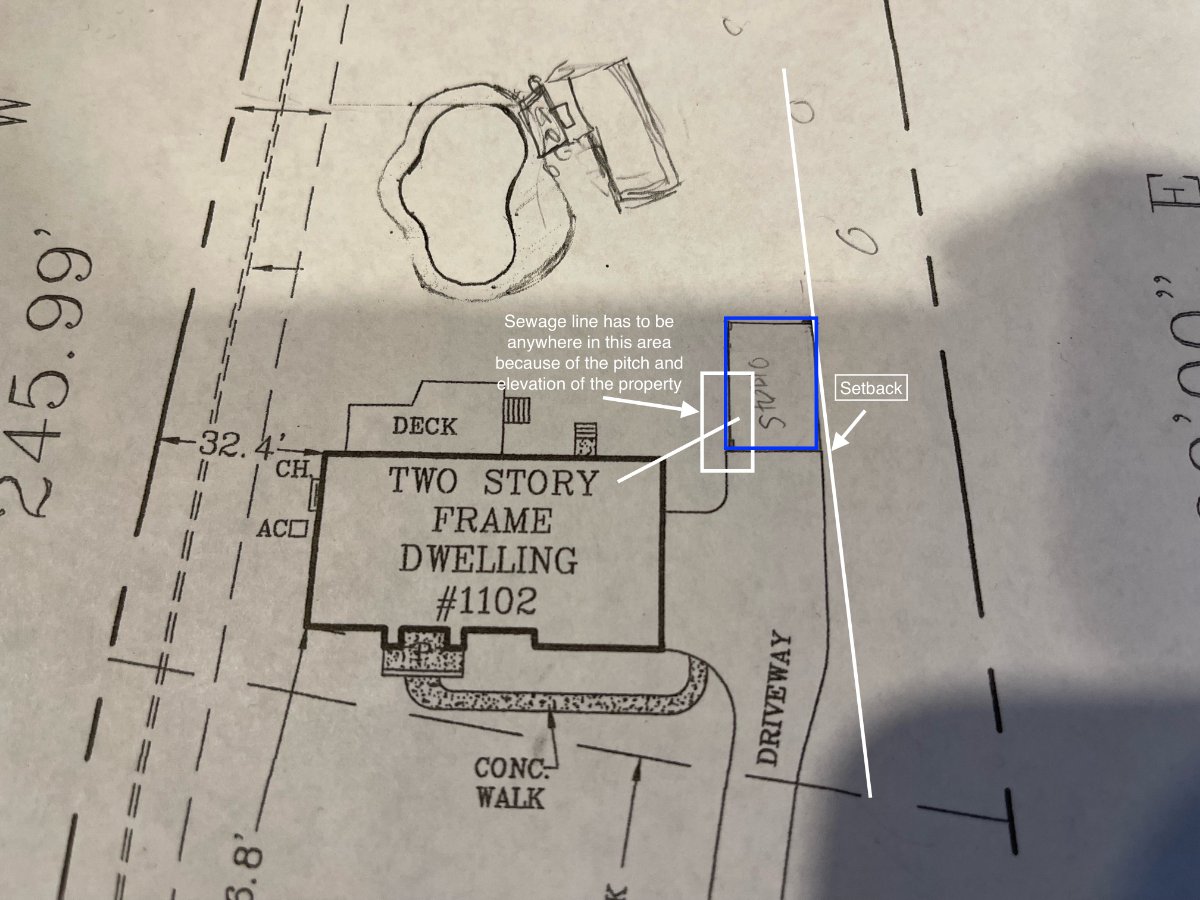 - Again, the bathroom has to be located in the corner of the new structure closest to the house to account for pitch of the sewageline and the grade of my property.