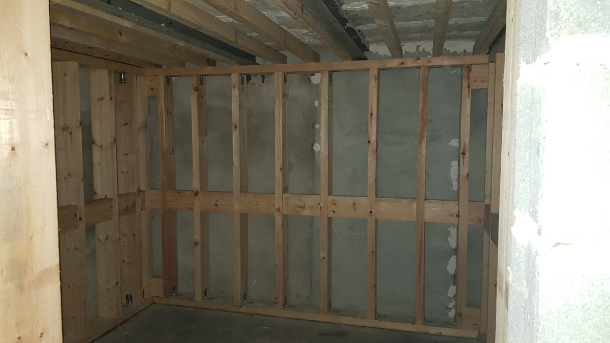 All the innerleaf framing is done, made of bastaings 18*6.5cm [7.09*2.56in] for the walls, and 9*6.5 [3.54*2.56in] for the ceiling (enough to carry 66kg/m² [~13.5lb/ft²][4boards+fiberglass]). The space between the studs (and the joists) is about 33cm [13in]. It's not touching the outerleaf anywhere, only bolt into the slab. The air space between the leaves will be between 20 and 23cm [7.87 and 9.06in] for the walls, 12 and 16 [4.72 and 6.3in] for the ceiling.