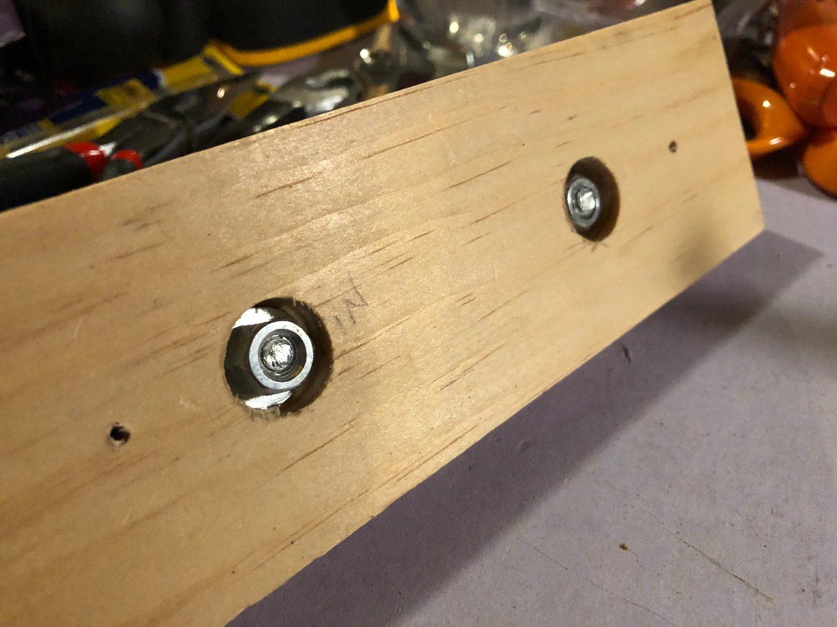 From underneath, I used a 5/8" wood bit to cut a level 'countersink' deep enough to handle the washer and nut.