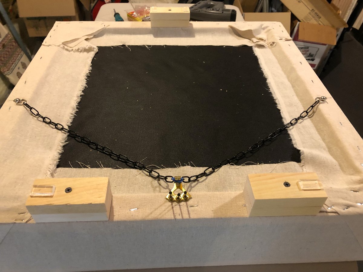 Because the back of the panel would be exposed [to the wall], I used that 'landscaping fabric' to cover the inside back [prevent any fiber escape], and still allow me access to the back frame for stapling and installing chain and wall standoffs.