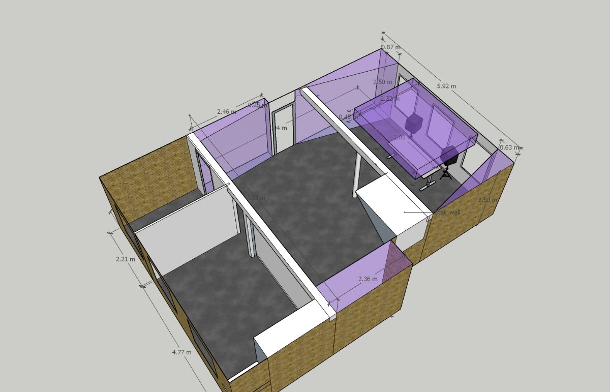 The purple areas are my intended treatement areas & i wanted to start with the cloud which is thicker/larger than you normally see as i'm trying to tame that 95 - 150 hz problem with it. I was going to oversize it so it gave some Bass trapping in the front wall/ceiling corner.