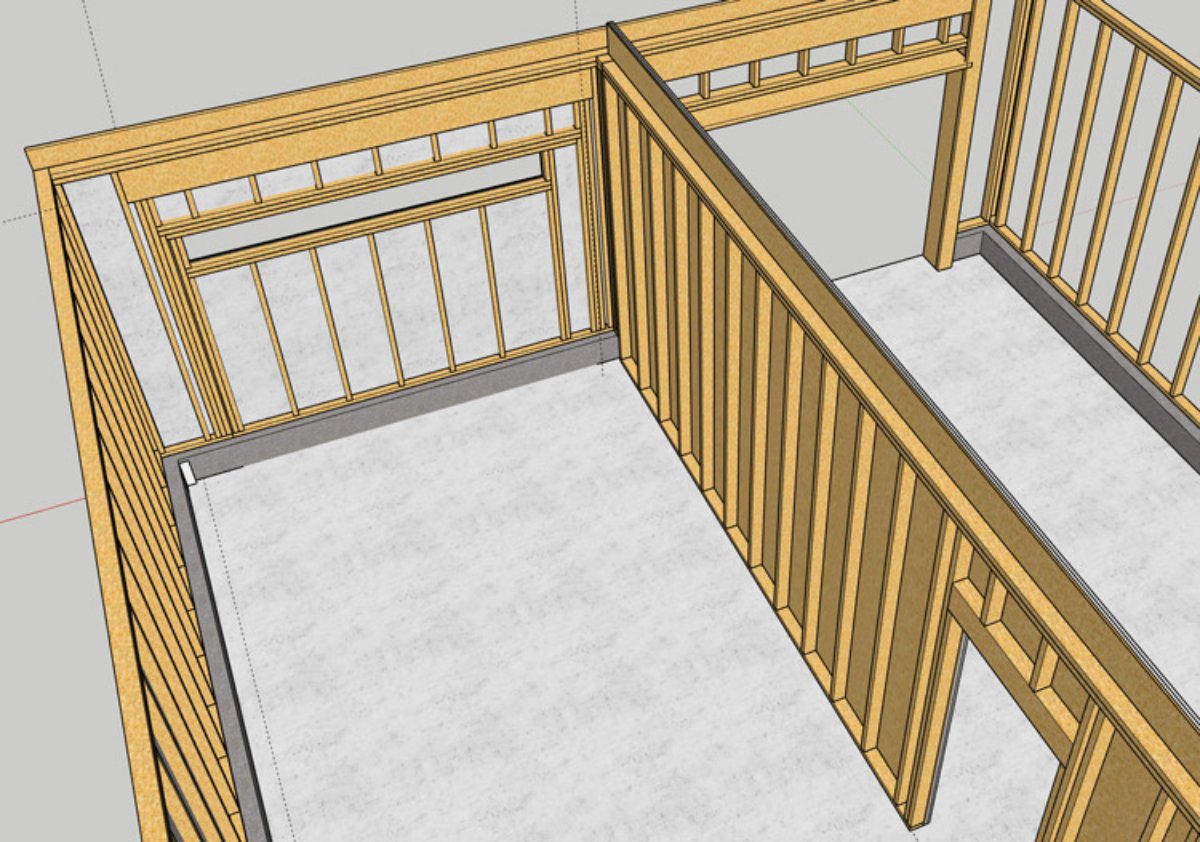 Note - This rough original model has all inside-out walls vs. the changes I mentioned above, and the door opening has now been moved away from the corner.