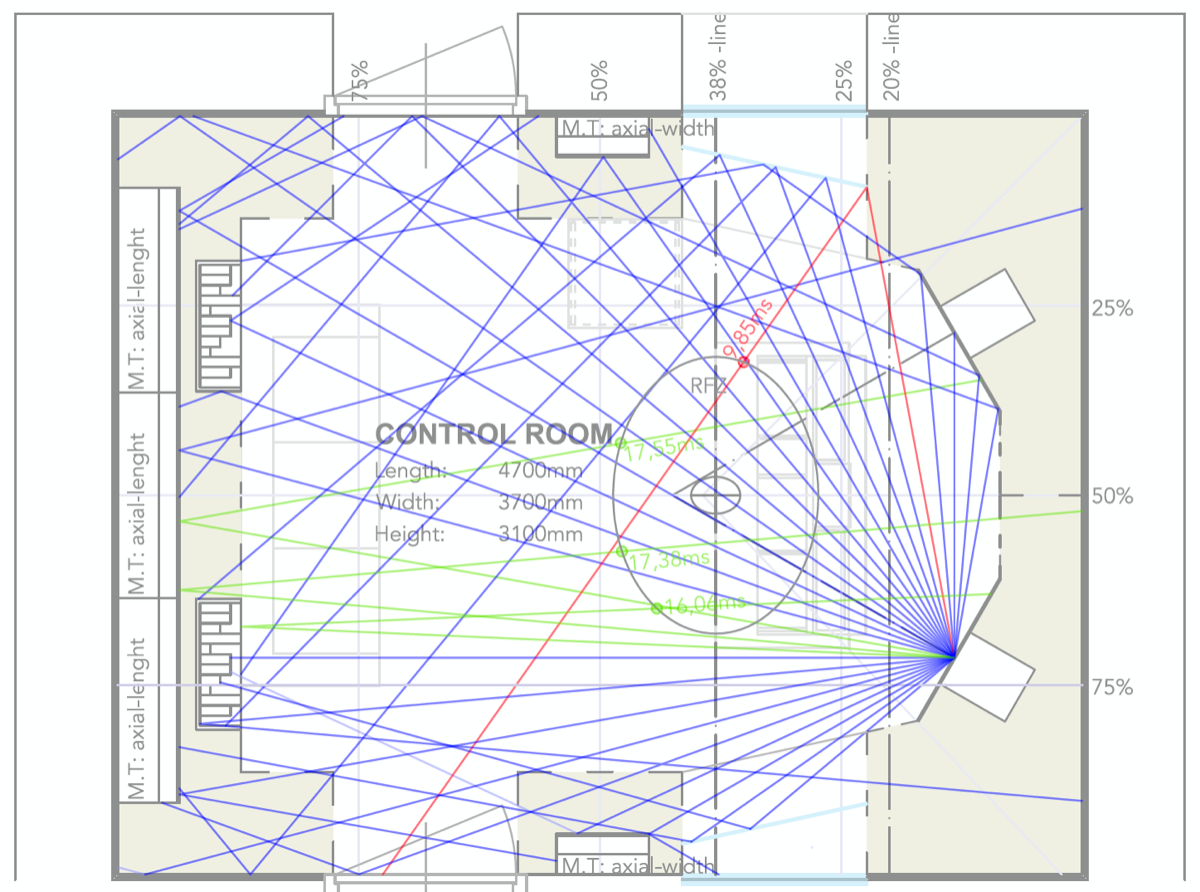 One of the things I did, trying to improve this design, is that I placed angled pieces of glass to redirect reflections away from the RFZ. I've tried to apply some rudimental ray tracing and I'm not entirely sure I'm doing things right, but it seems that almost every reflection doesn't enter the RFZ within 15ms (blue lines). There are a few reflections from the back that are entering the RFZ after 15ms (the greens lines) but those are heavily reduced by the back wall or they have been diffused by the diffuser (also returning after 15ms).