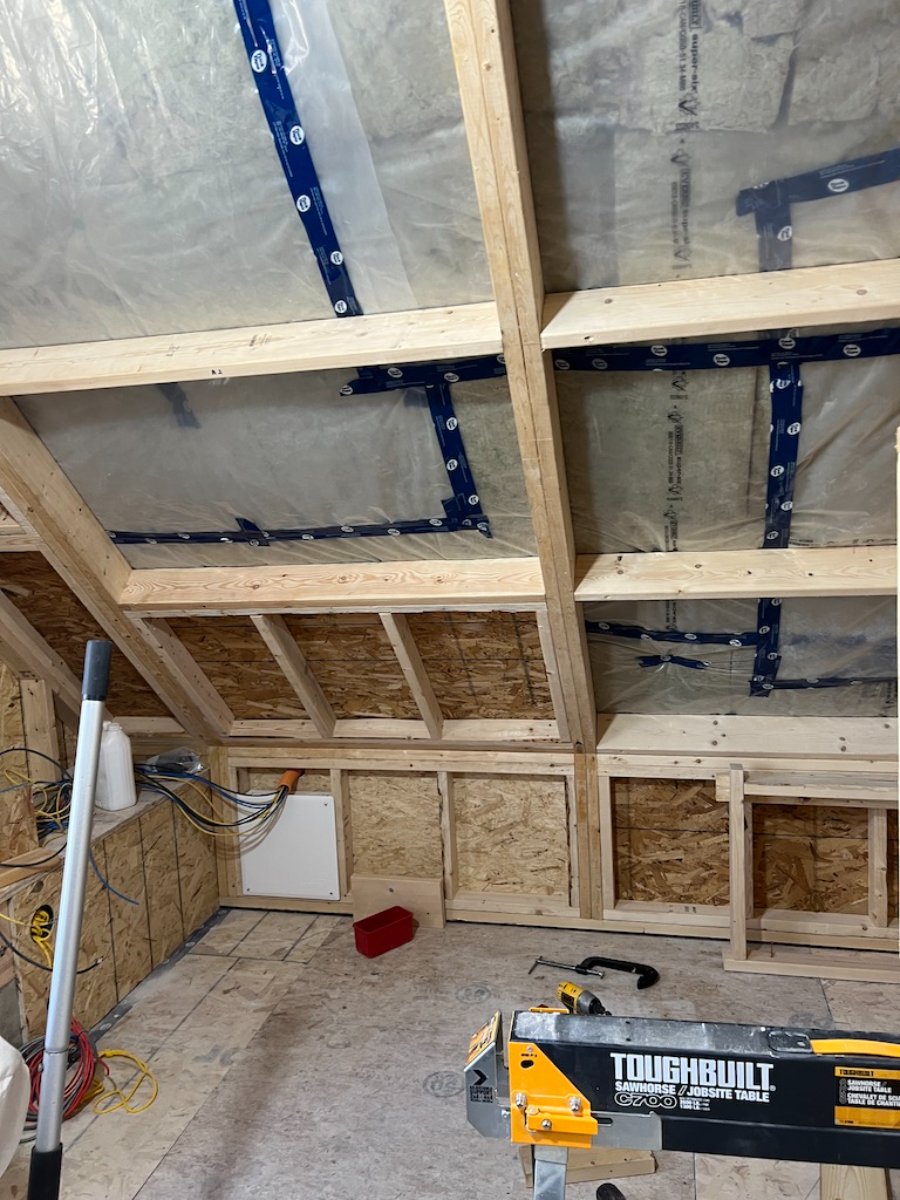 Here I closed off the room by putting up the 3/4 OSB on the back wall. I still need to install the drywall on the outside before hooking up the duct system to the baffle boxes.