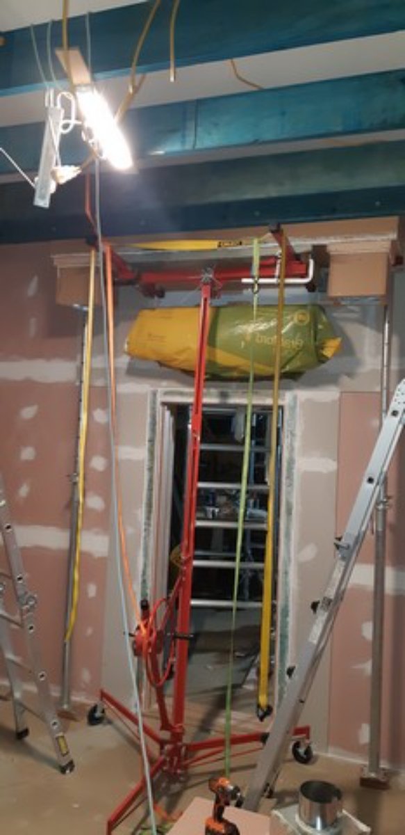 I’d been dreading this for a while – I knew the hanging of the internal silencers would be fun! I’d looked at a few material handling lifts I could hire for the job locally but complications with access, availability, free floor space and with the supply unit having to be lifted then pushed in to get around the AC, meant that the best tools ended up being a combination of;