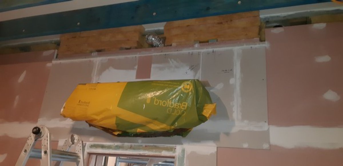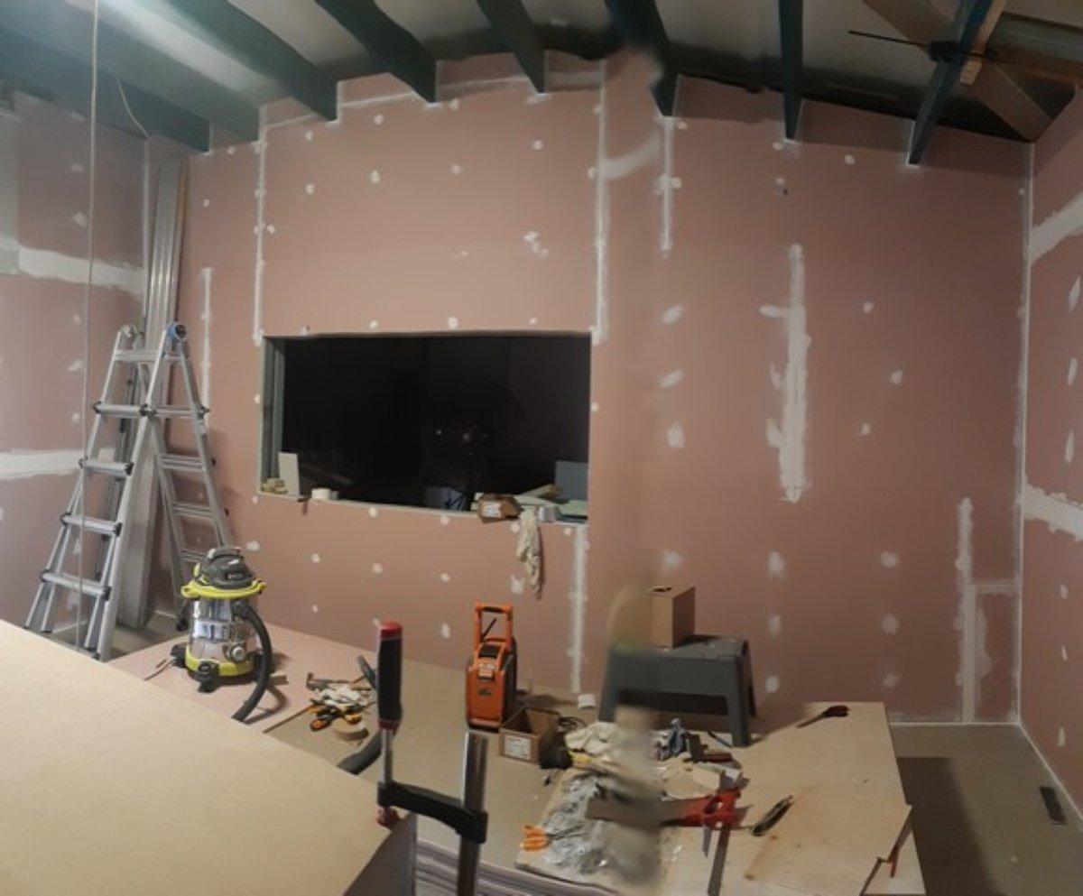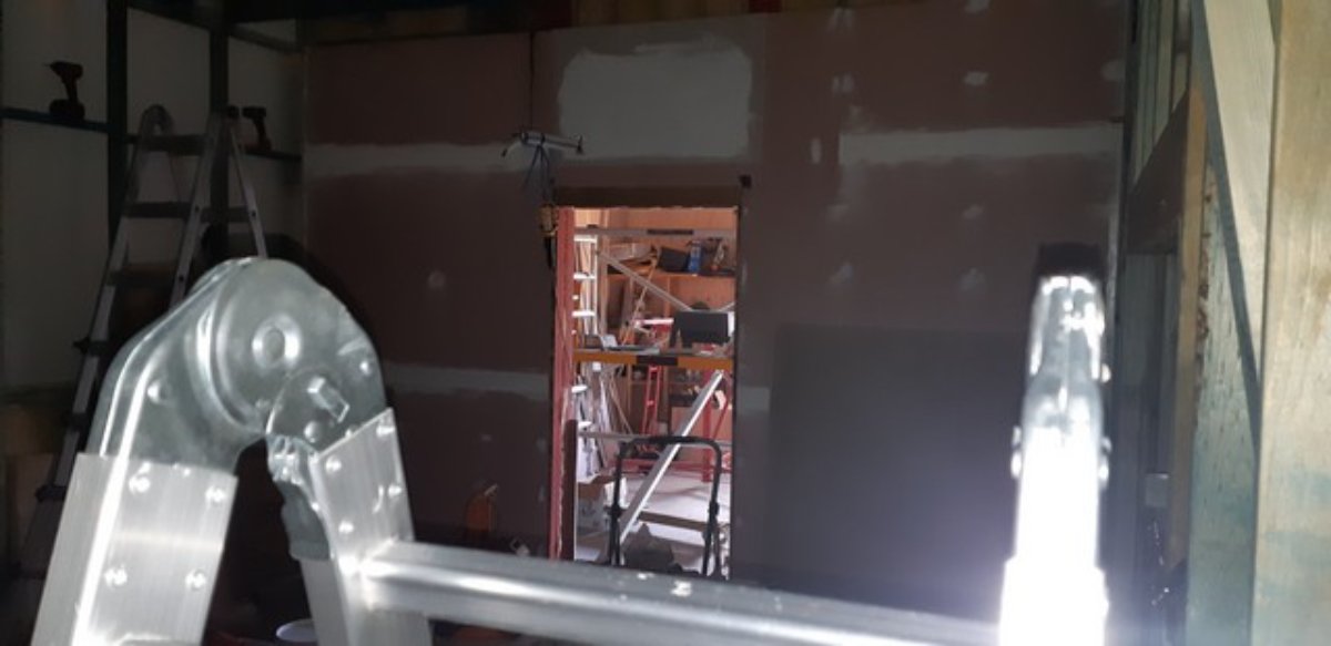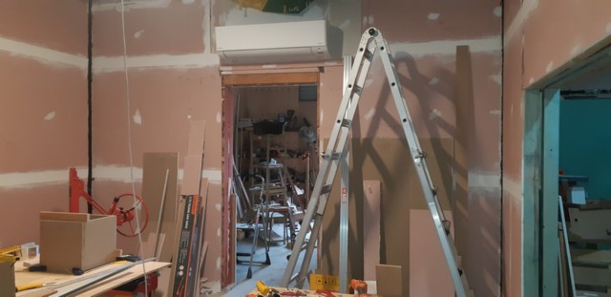 • The AC units are in and I’ve just to do the last 10% of the “Big Stretch” sealing of the penetrations. I had to bring forward the finishing of inner room walls on the workshop ends of the CR and LR to allow mounting of the inside end of the split units.