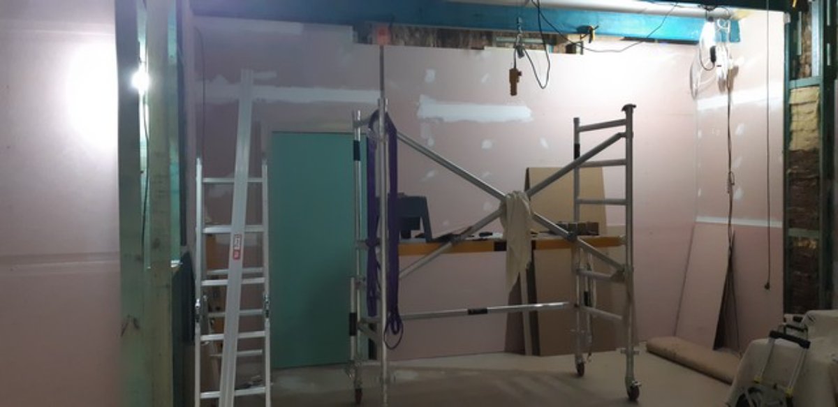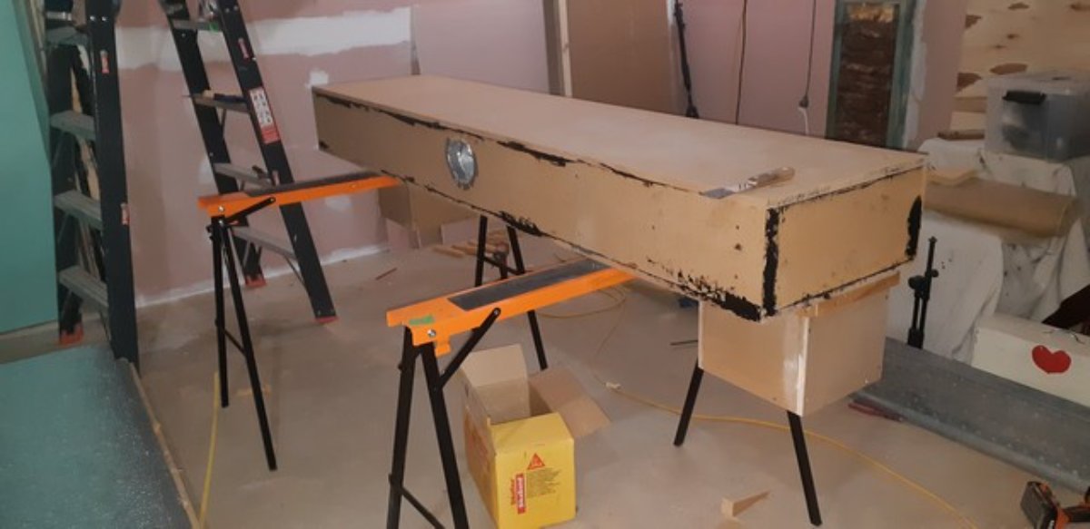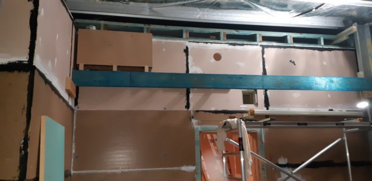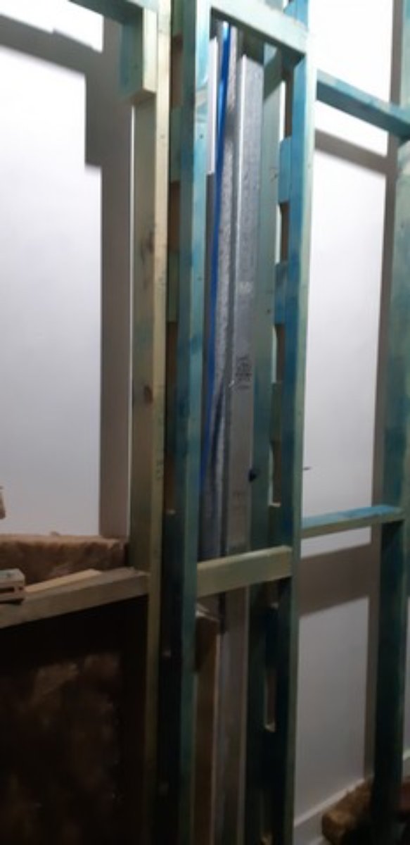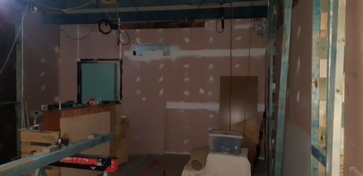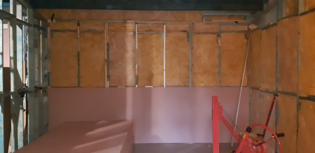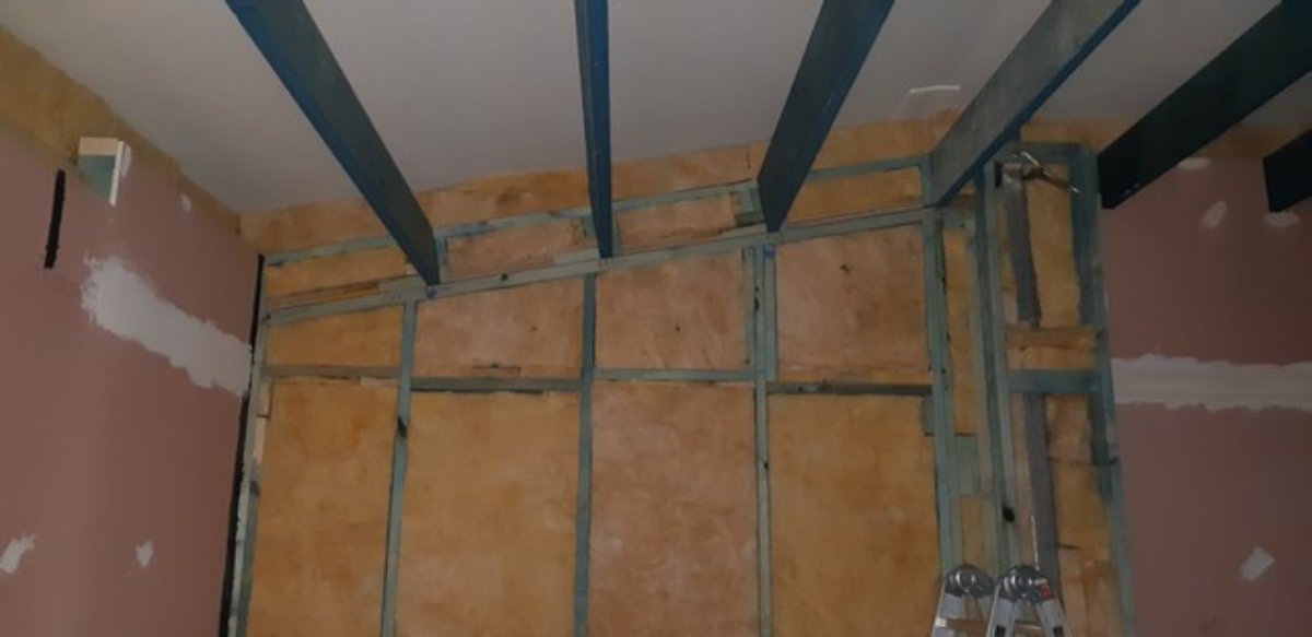 CR RH wall - yet to do layer 2 around the mullion post which will be mdf (a bit harder than gyprock) - part of mdf layer is standing next to it. Inner silencers almost ready to mount