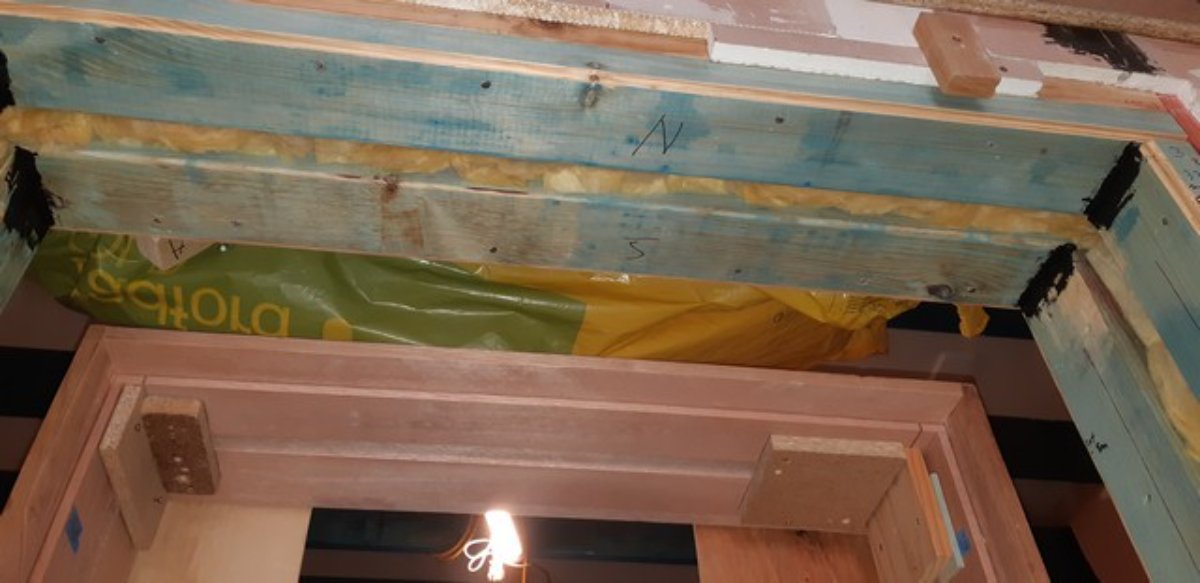 layer 1 of outer wall - you can still see the CR door frame - LVLs right up both sides and over the top that connect eventually to the sway braces which in turn are bolted to the metal shed frame