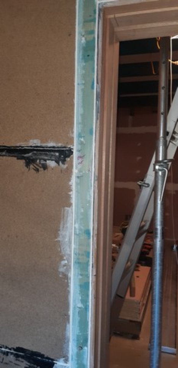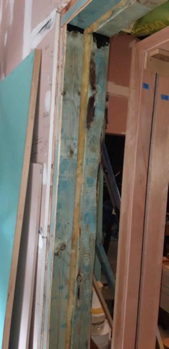 Once I'd got the jamb in place I then re-inforced it with some 70x35 timber you can see in the attached - these attach to the jamb, and hard up against the frame including the LVLs that run up to the top plate and the sway brace. To do this I stopped the gyprock/yellowtongue 70mm short of the jamb position - again I ran a rebate along the edge to apply another layer of sealant. This arrangement will give me a very solid base for the hinge screws. :D