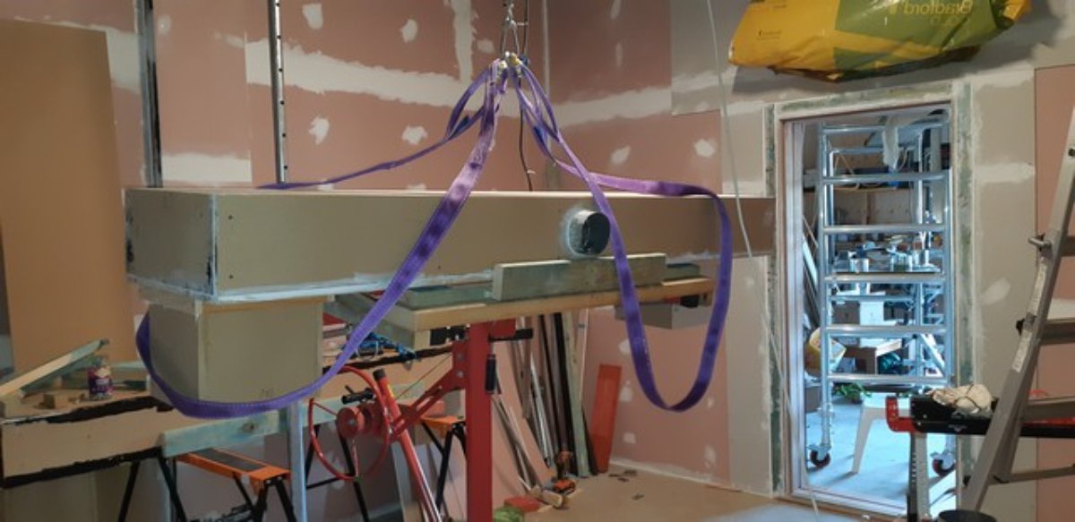 I started with the supply unit – I’d left the very top piece off which reduced the weight of the unit to 53kg (lift capacity = 68kg). I’d worked out that I could add this in situ if I predrilled the screw holes and only raised it initially so that the top aligned with the top of the joists rather than sitting about 150mm above them as it would be when in place. I had also worked out that I would need to remove the rail that would hold the bearers the unit would sit on, so as to create enough room to raise the unit into the space. I had also knew that I needed to install the spigot for the flex-duct attachment before it went up as the only thing I could realistically do about ducting while in situ was to attach the duct to the collar.