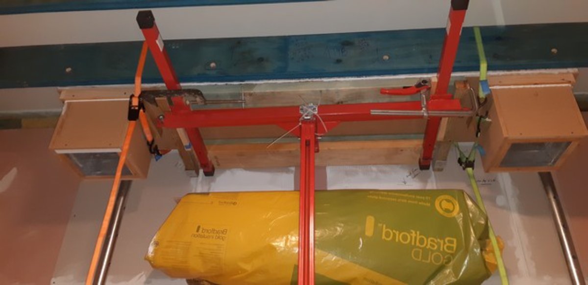 Happiness restored, I set about building a frame for the box to sit on – this was clamped to the drywall lift and designed to compensate for the fact that the box needed to sit on the edge of the drywall “forks” which causes them to slope down.