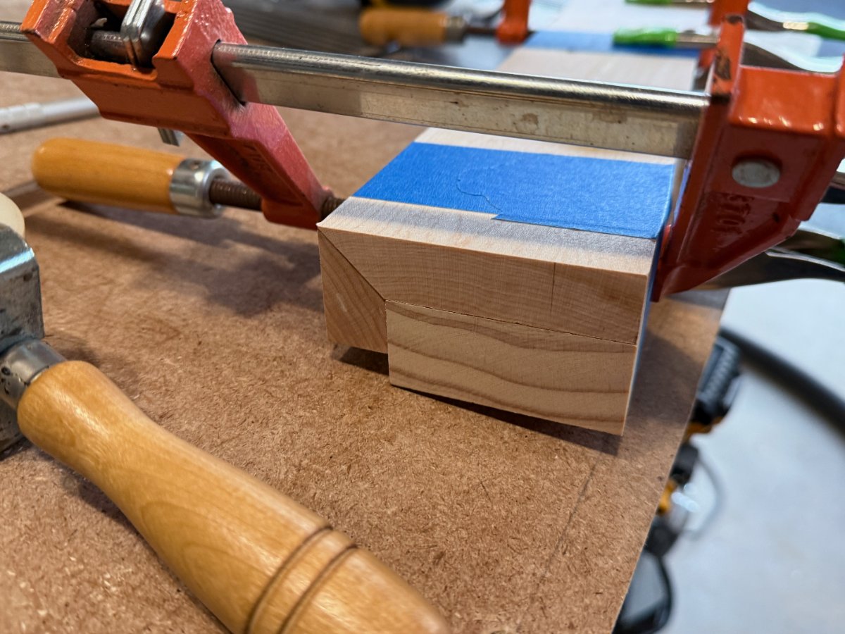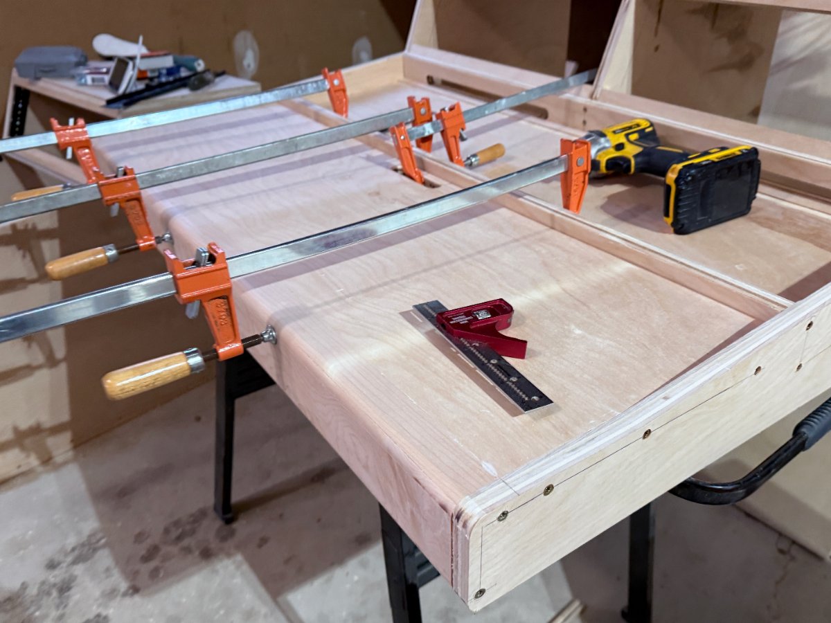 Just a shot of the complicated glue up here for the front rail as well as the SSL tray. Was critical to get these correct as there is a slight angle to the tray (about 5 degrees) so took a bit to fit it up perfectly. Then I glued and screwed it all together.