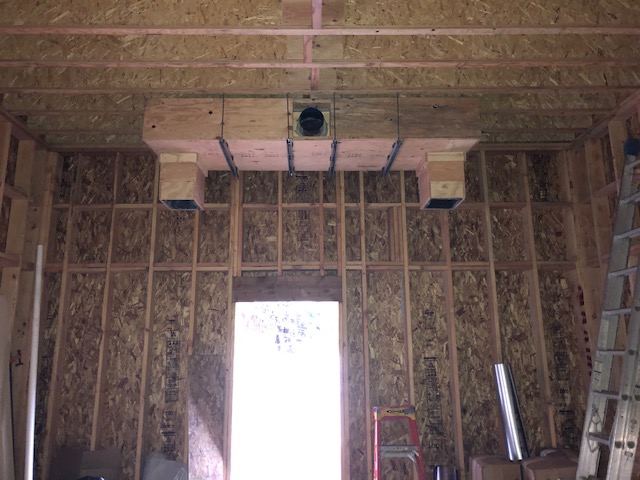 Well weeks went by before we talked again. During this time the builder, on his own accord, did the exact nailing schedule Stuart had suggested. When I mentioned to him that the GC thought he could use 8s on both layers, he scoffed at that idea, stating the obvious that the wall is 1.5 inches thick and 8s wouldn't cut it. The roof was built, the drywall was installed on top of the OSB in the attic, shingles were added to the roof, the front porch was constructed, the kitchenette windows and door were added and framed, three sides received siding, the attic door was framed, the silencer boxes were constructed, delivered, and hung. We modified the silencer box sleeves due to the 2x12 joists that were used prior to hanging. The HVAC ducted mini split and ducts were hung. We are going to test it next week after it is completed.