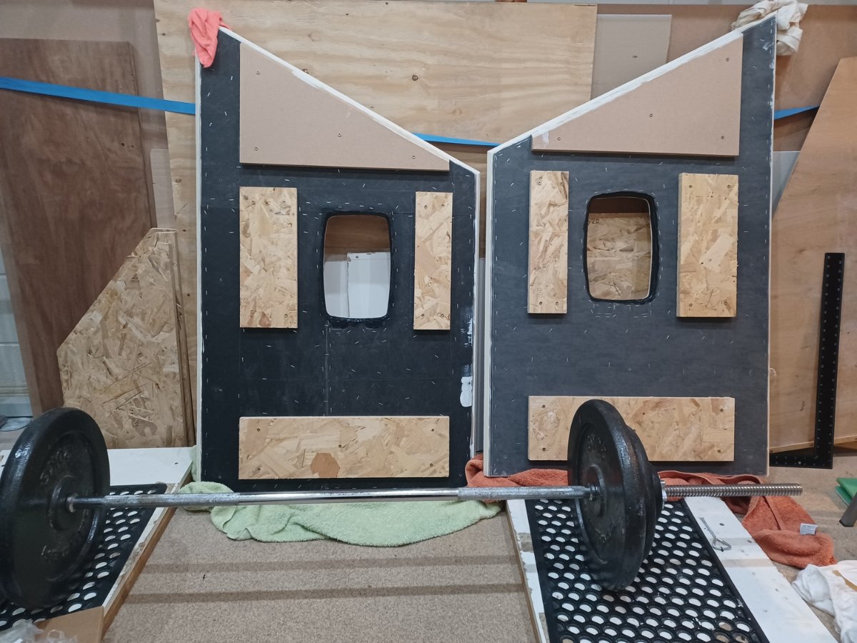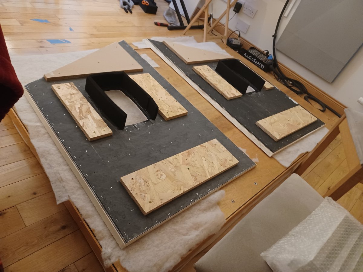 Added an extra layer of 18mm thick wood to brace the back of the baffle faces and add extra mass to reduce sound transmission. These fit around the soffit frame.