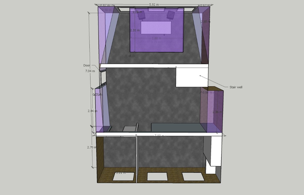 The purple areas are my intended treatement areas & i wanted to start with the cloud which is thicker/larger than you normally see as i'm trying to tame that 95 - 150 hz problem with it. I was going to oversize it so it gave some Bass trapping in the front wall/ceiling corner.